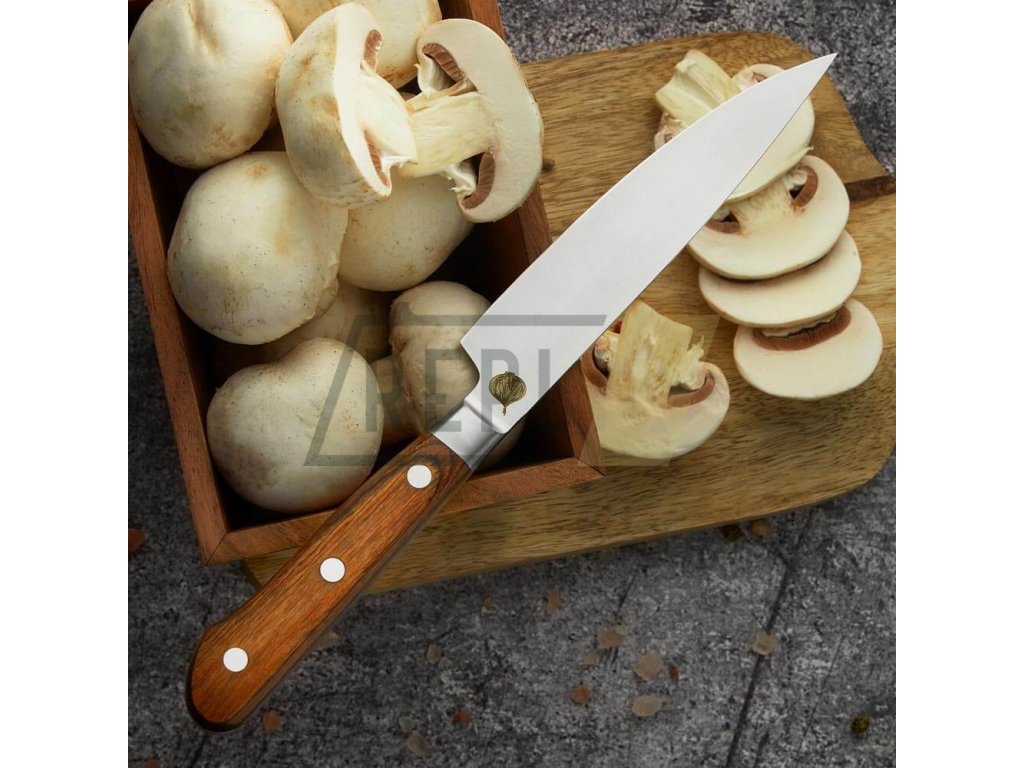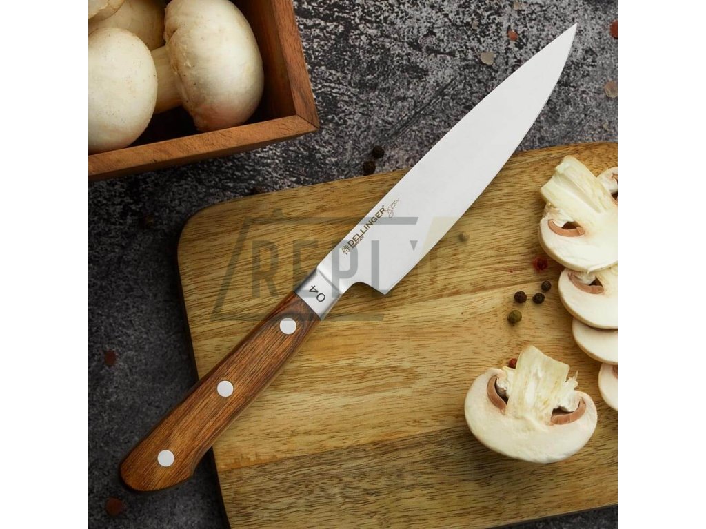 Čtvrtý nůž z nové série Dellinger Essence. V Japonsku by se pomocnému univerzálnímu noži říká "petty utility knife" (ペティナイフ, peti-naifu). Petty Utility knife je univerzální pomocný nůž, který doplňuje větší nože a je ideální pro precizní úkoly, jako je krájení menších surovin, loupání, filetování nebo dekorace. Tento nůž, který ocení "nejen" každá žena se skvěle se hodí pro práci s drobnějšími surovinami v kuchyni, jako je krájení zeleniny nebo cibule. Nůž s čepelí dlouhou 130 mm je vyroben z německé oceli 1.4116, známé svou vysokou odolností proti korozi a schopností udržet ostří po dlouhou dobu. Univerzální nůž s rukojetí z pakkawoodu, která je nejen stylová, ale i odolná vůči vlhkosti a teplotním změnám.