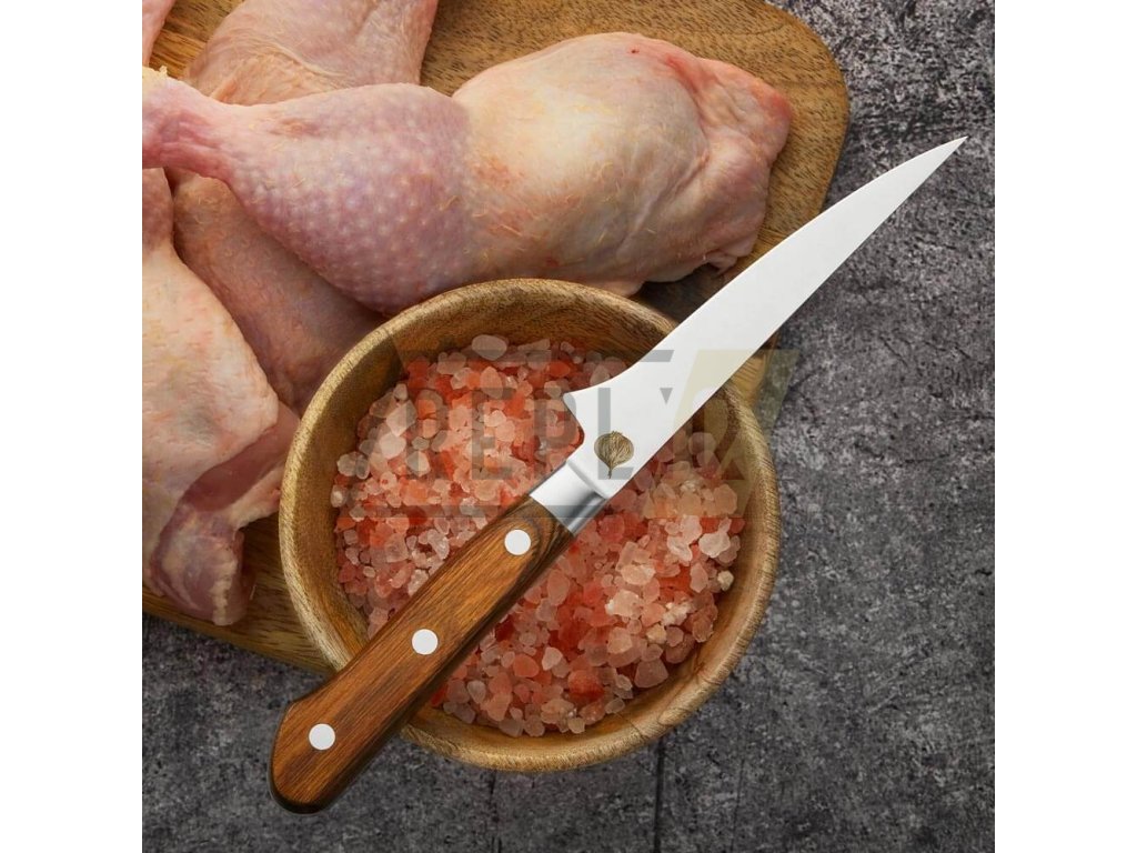 Šestý nůž z nové série Dellinger Essence. Vykošťovací nůž "kostěj" je navržen v japonském stylu, kde se nazývá Honesuki (ほねすき). Je určený především pro zpracování masa, konkrétně k oddělování masa od kostí, například při porcování drůbeže. Má ostrou špičku a trojúhelníkový tvar čepele, což umožňuje přesnou a účinnou práci kolem kloubů a kostí. Na rozdíl od západních vykosťovacích nožů není flexibilní, což je typické pro japonské nože. Nůž s čepelí dlouhou 120 mm je vyroben z německé oceli 1.4116, známé svou vysokou odolností proti korozi a schopností udržet ostří po dlouhou dobu. Vykosťovací nůž s rukojetí z pakkawoodu, která je nejen stylová, ale i odolná vůči vlhkosti a teplotním změnám.