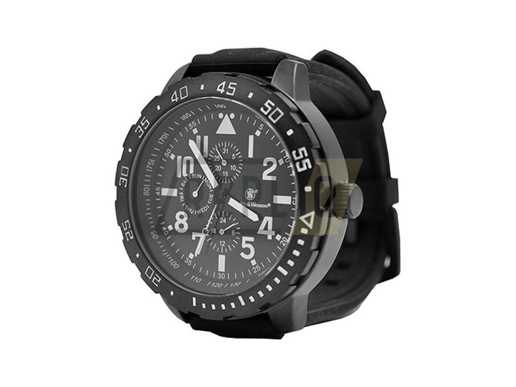 Kvalitní hodinky od známé značky Smith & Wesson nesoucí jméno CALIBRATOR. Poměrně mohutný budík je vyveden z nerezové oceli v černé barvě s bílými čísly, jeho chod zajišťuje přesný japonský quartzový strojek. Malé ciferníky ukazují datum i den v týdnu (anglické zkratky). Tvrzené minerální sklíčko odolá skrábáncům při běžném používání. Hodinky jsou voděodolné až do 50 M, což z nich dělá vhodný doplněk vybavení pro všechny dobrodruhy i turisty, jsou v oblibě i u ozbrojených složek. Velmi pohodlný gumový řemínek je obšitý bílou nití.