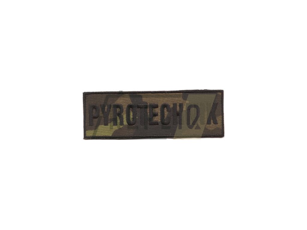 Malá nášivka s nápisem PYROTECHNIK na maskáčovém podkladu vz.95 podkladu černě vyšité. Velikost cca 4x12 cm. Určeno pro našití.