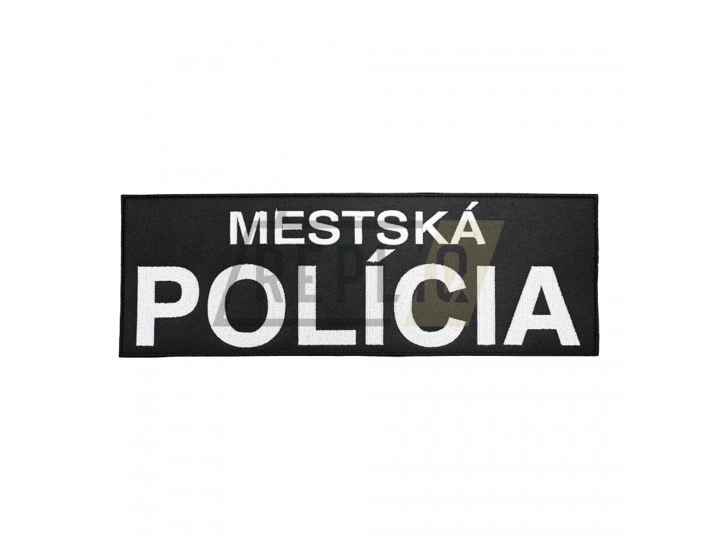 Velká nášivka s nápisem MESTSKÁ POLÍCIA, na černém podkladu bílá nit - výšivka. Na suchém zipu, vhodná pro umístění na všechny velcro panely ať už na oblečení nebo na výstroji. Velikost cca 30 x 10 cm.