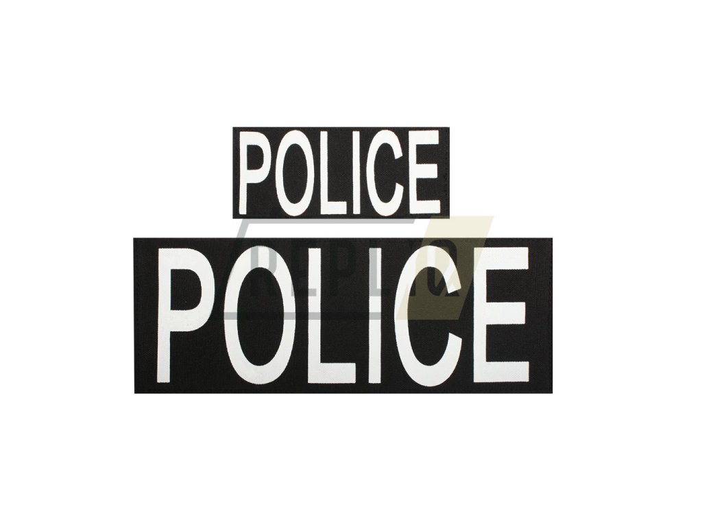Sada dvou kusů nášivek s nápisem POLICE. Malá 6 x 14,5 cm vhodná na přední stranu. Velká 10 x 27 cm vhodná na záda. Obě nášivky jsou na suchém zipu.