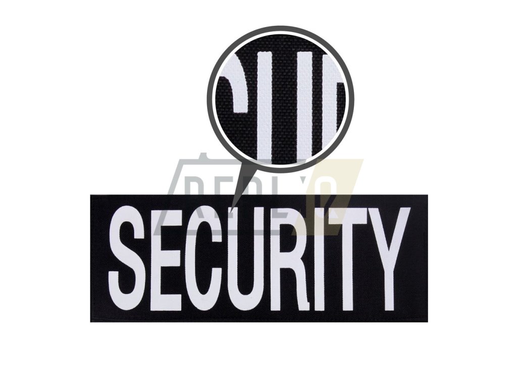 Sada dvou kusů nášivek s bílým potiskem SECURITY. Malá 6 x 14,5 cm vhodná na přední stranu. Velká 10 x 27 cm vhodná na záda. Obě nášivky jsou na suchém zipu.