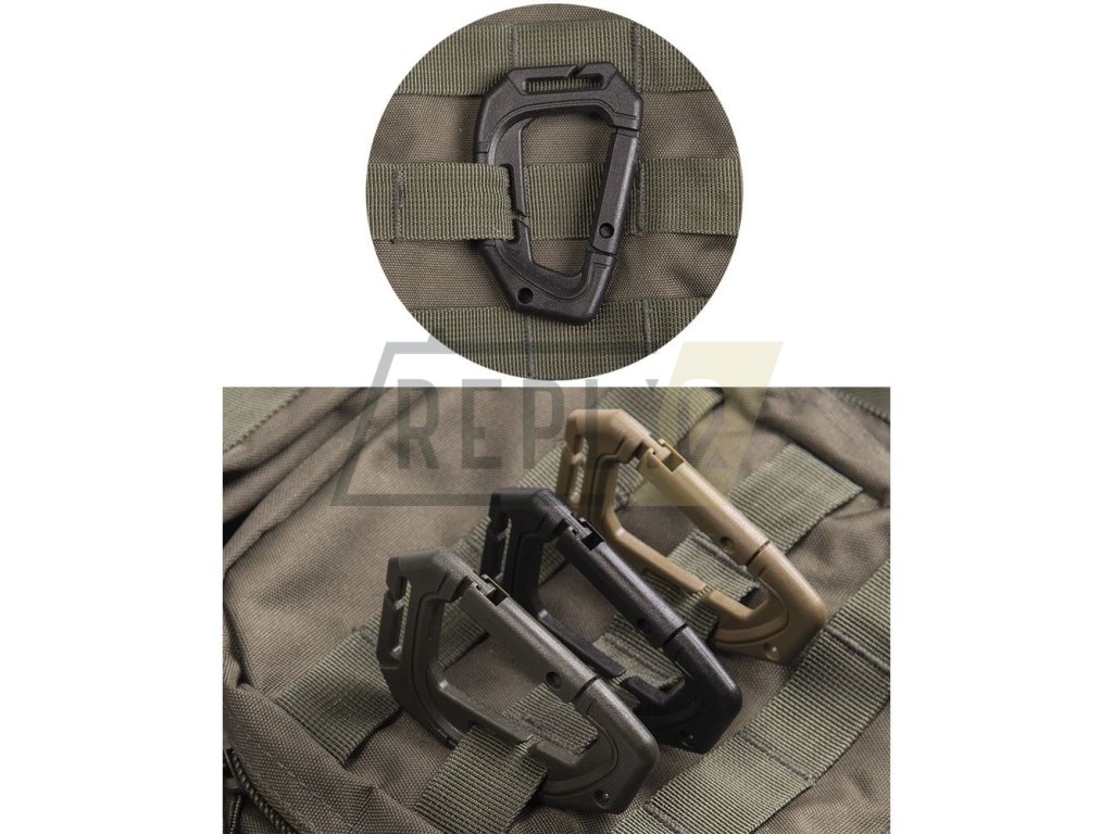 Nový model taktické MOLLE plastové karabiny z materiálu Polyoxymethylene. Velikost: 9,3 cm, hmotnost: 24 g. V balení 2 kusy.