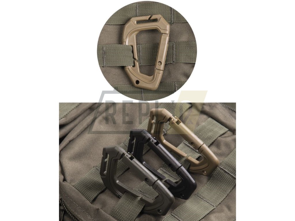 Nový model taktické MOLLE plastové karabiny z materiálu Polyoxymethylene. Velikost: 9,3 cm, hmotnost: 24 g. V balení 2 kusy.