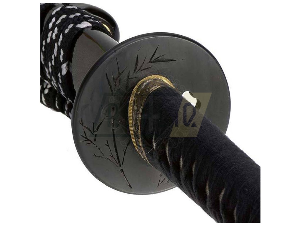 Černá lakovaná pochva ve vysokém lesku (styl cha išimi) se zlatými bambusovými lístky a koncovými prvky (kojiri, kurigata, koiguchi) z buvolího rohu.