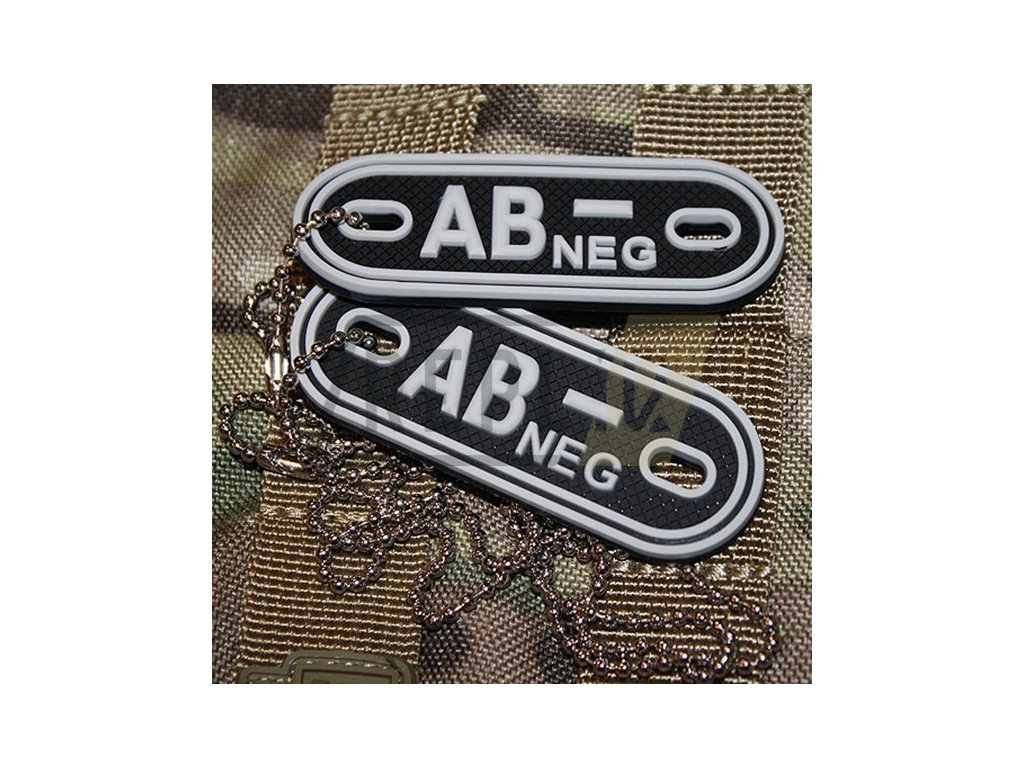 "Identifikační známky" s označením krevní skupiny (AB- / negativní). Dvě známky na jednom řetízku. Rozměr 7 x 2,5 cm.