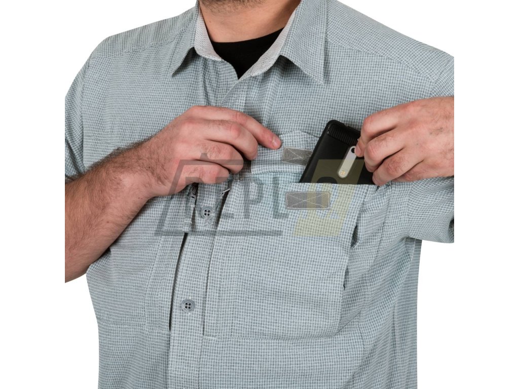 Košile se zapíná na knoflíky, které jsou označeny nenápadným logem značky HELIKON-TEX. Na hrudníku naleznete celkem čtyři kapsy. Dvě velké uzavírané pomocí suchého zipu poskytují dost místa na přenášení drobnějšího vybavení, nebo elektroniky jako jsou chytré telefony apod. Pod těmito kapsami najdete další dvě kapsy uzavírané pomocí YKK zipů. Ty jsou poměrně ploché, využijete je na přenášení například dokumentů, cenností atd. Límec košile je opatřený měkkou síťovinou, je proto velmi komfortní a prodyšný. Malým bonusem je pak poutko na zavěšení slunečních brýlí.