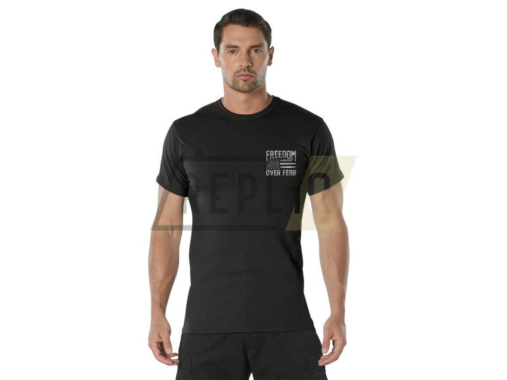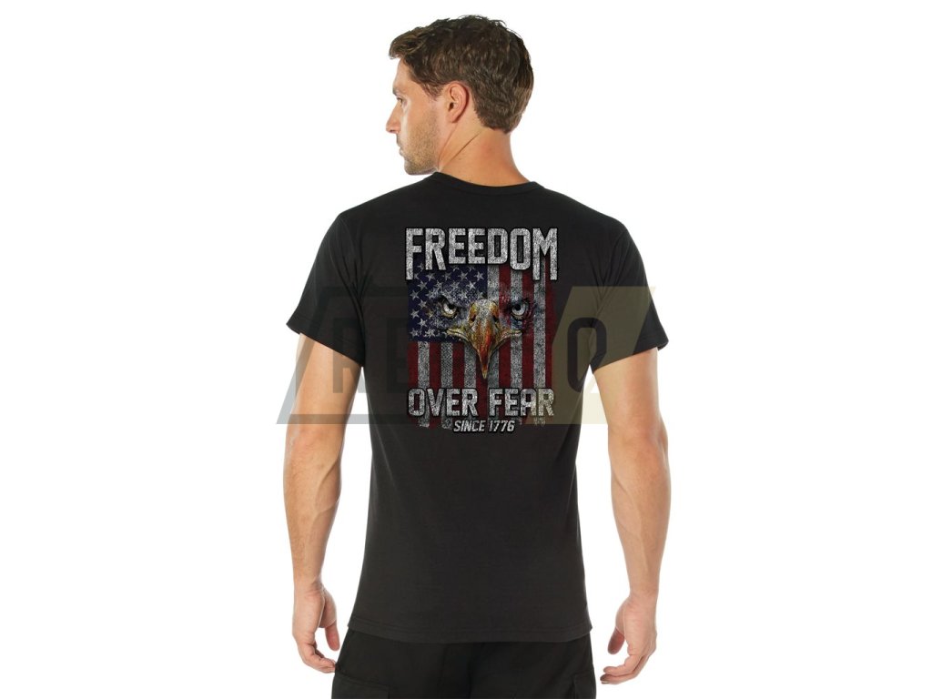 Pohodlné tričko vyrobené z na omak velmi příjemného a prodyšného bavlněného materiálu. Konstrukce trika disponuje zesílenými švy. V přední části trika naleznete nápis FREEDOM OVER FEAR (svoboda nad strachem), zadní části "vévodí" americká vlajka s kombinací hlavy orla.