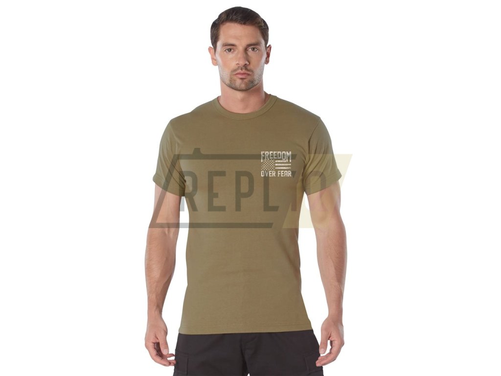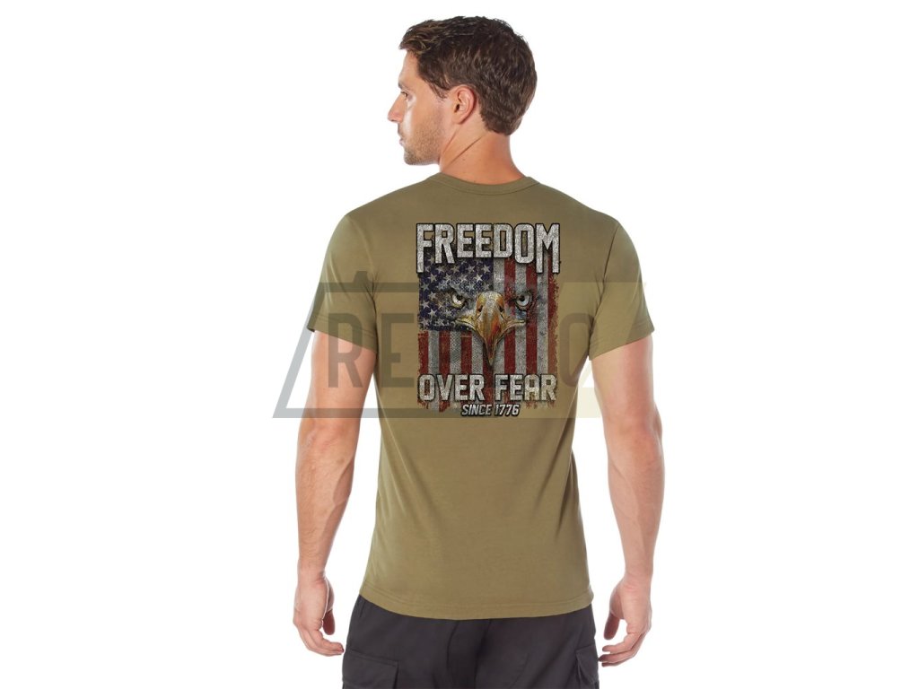 Pohodlné tričko vyrobené z na omak velmi příjemného a prodyšného bavlněného materiálu. Konstrukce trika disponuje zesílenými švy. V přední části trika naleznete nápis FREEDOM OVER FEAR (svoboda nad strachem), zadní části "vévodí" americká vlajka s kombinací hlavy orla.