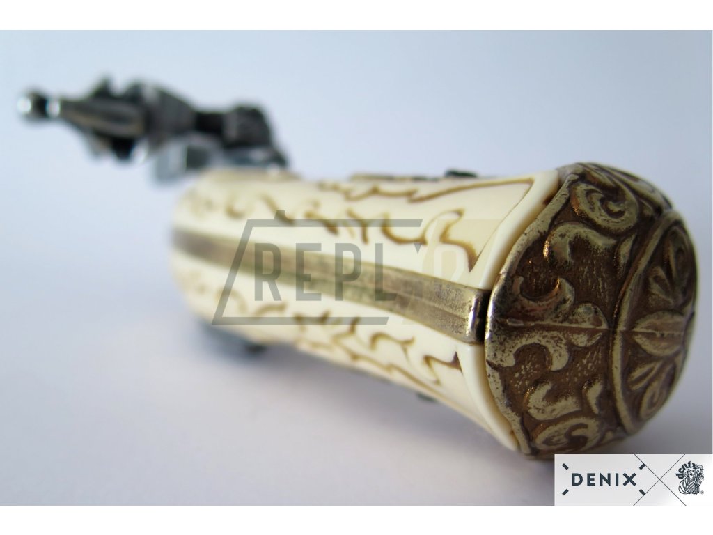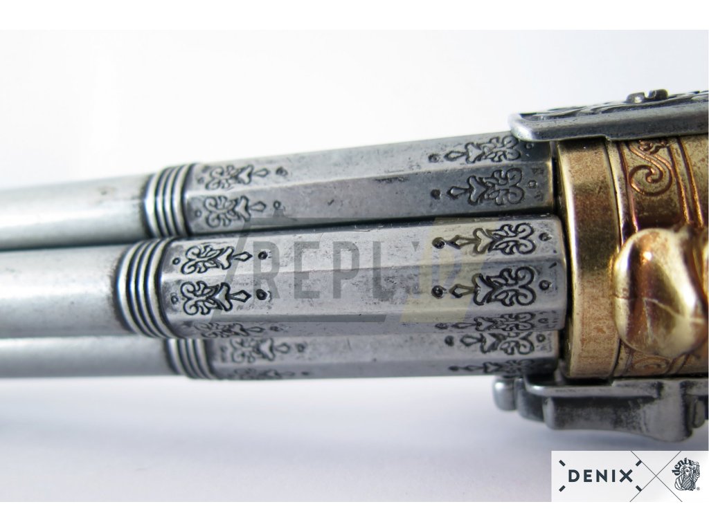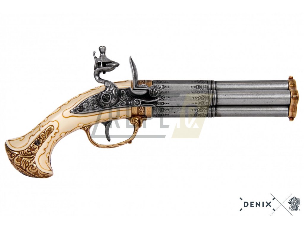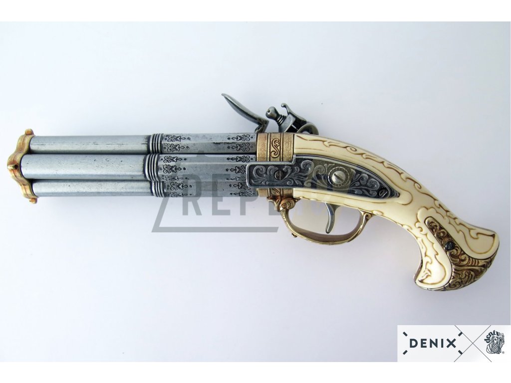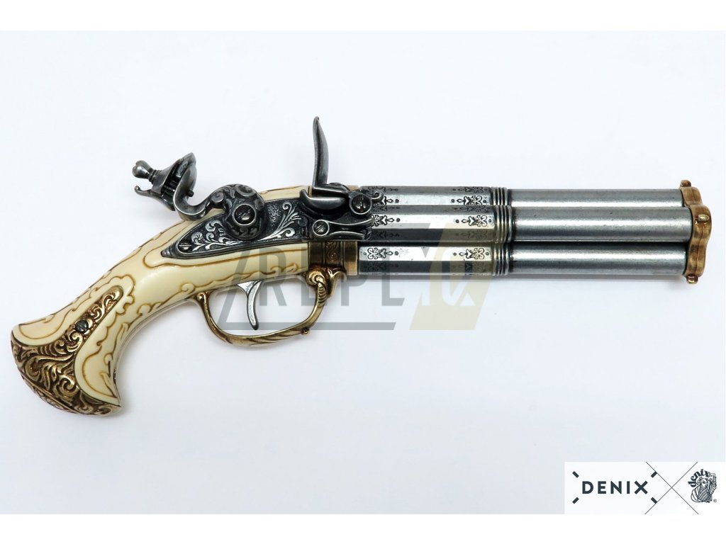 Čtyřhlavňová křesadlová pistole - Francie 18. stol. + Přívěsek na klíče DENIX