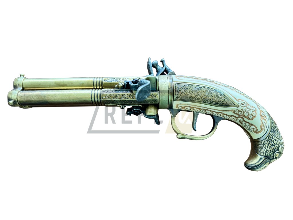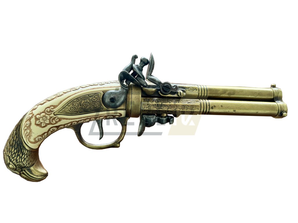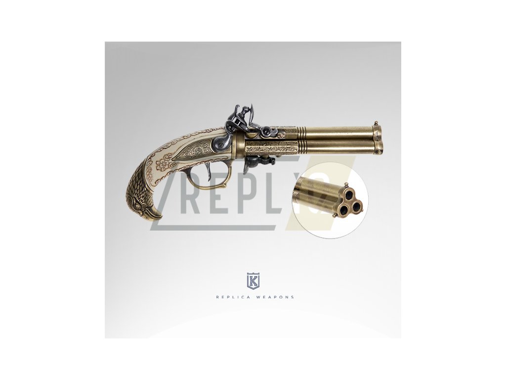 Pistole vyniká unikátním designem se třemi hlavněmi umístěnými vějířovitě vedle sebe, které měly zvýšit šanci na zásah při jediné salvě. Detailní rytiny, elegantně tvarovaná pažba a kvalitní zpracování dělají z této repliky skutečný sběratelský klenot.
