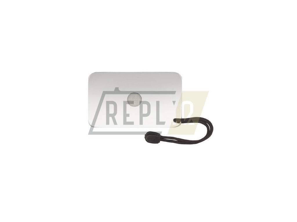 Signální zrcátko, uprostřed s pozorovacím otvorem. Rozměr cca 5 x 7 cm.