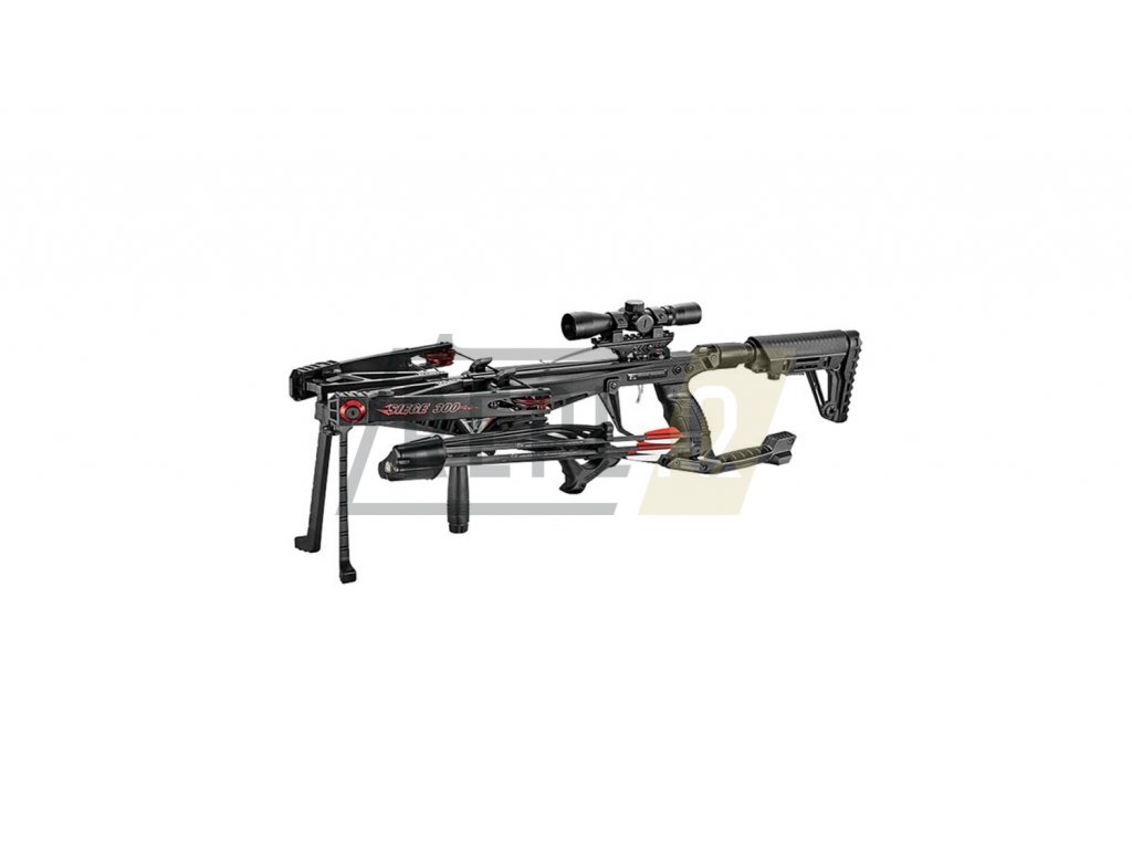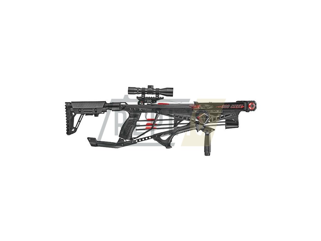 Balení obsahuje kušohled, tři carbonové šípy o délce 15,5” (39 cm), odnímatelný držák šípů, ramenní popruh a tuk na tětivu.