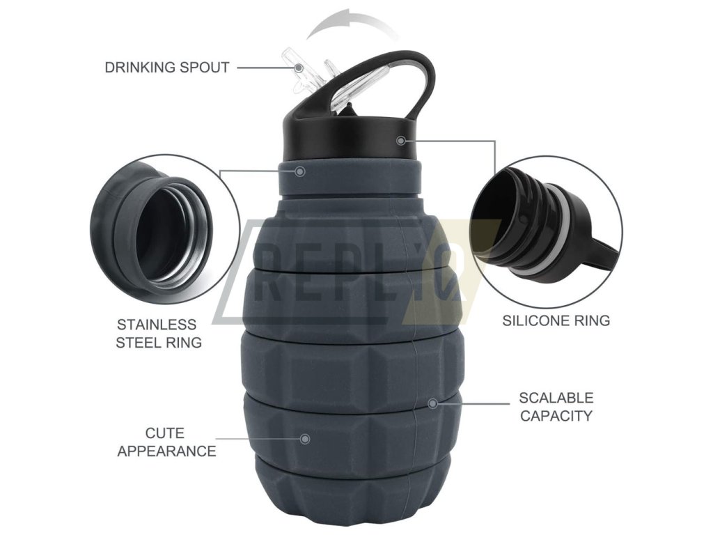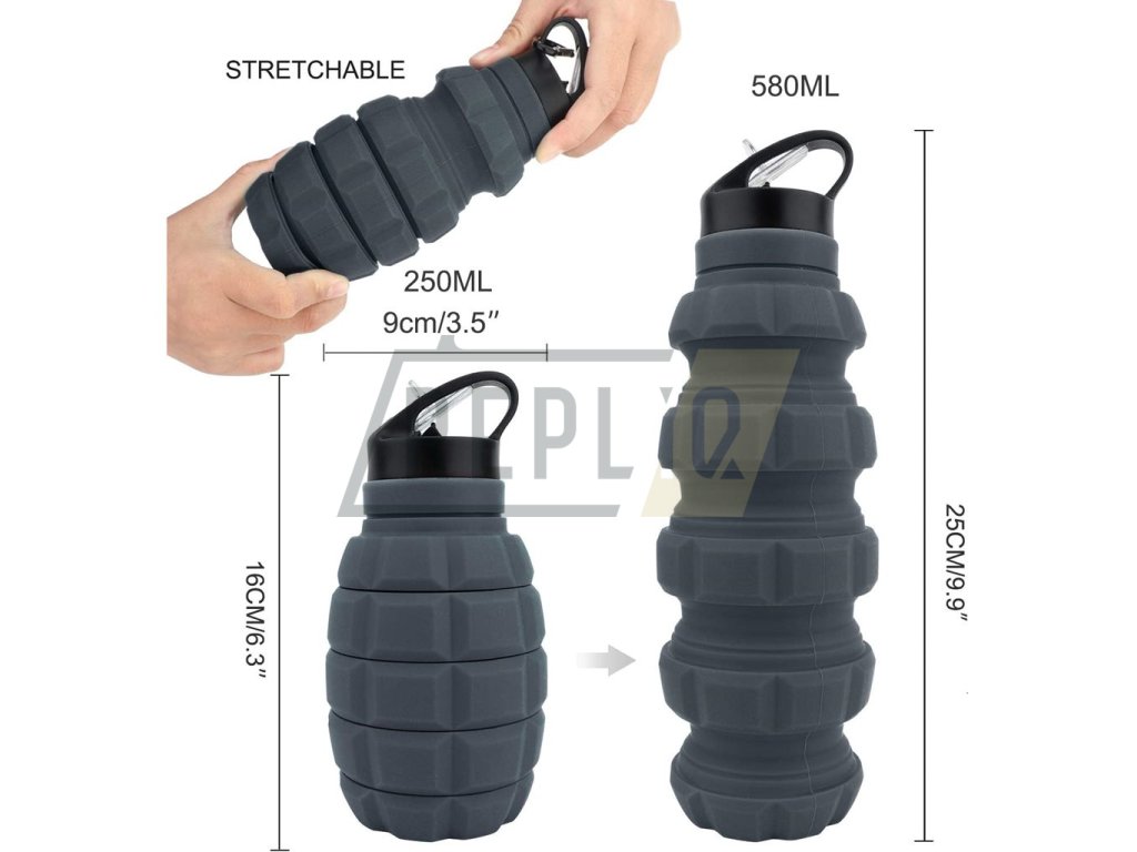 Praktická a hlavně stylová skládací láhev na vodu o maximálním objemu 580 ml. Ve složeném stavu nabízí 250 ml objemu. Na výrobu láhve byl použit odolný potravinářský silikon bez BPA, jehož teplotní odolnost činí od -40 °C do 230 °C. Hrdlo láhve je vyztužené za pomoci kroužku nerezové oceli a víčko disponuje silikonovým těsněním. Před prvním použitím vypláchněte teplovou vodou, nepoužívejte v mikrovlnné troubě, troubě, na ohni a jiných zdrojích přímého tepla.