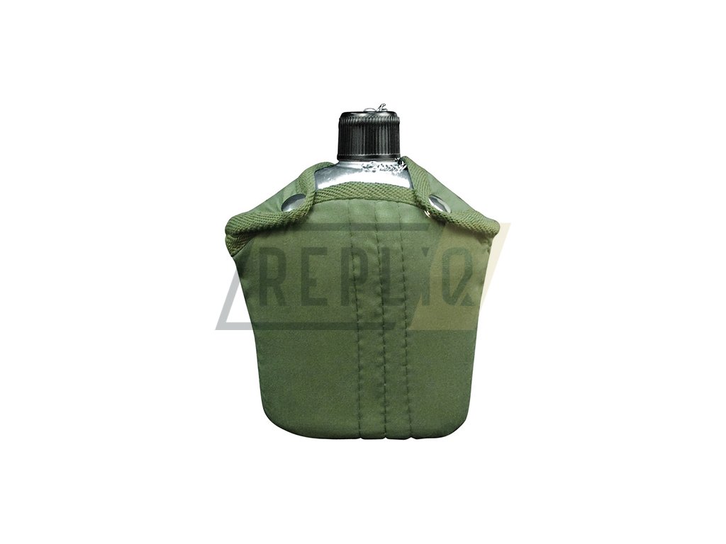 Hliníková polní láhev US typu o objemu 1 Qt (necelý litr), včetně obalu s poutkem na opasek.