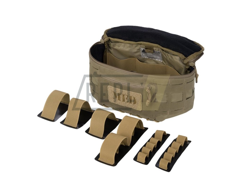 Nosný popruh ledvinky je délkově nastavitelný a spíná se pomocí plastové přezky. V přední části naleznete panel suchého zipu pro vaše VELCRO nášivky. Pod panelem se nachází plochá kapsa uzavíraná zipem, která je ideální pro uložení například jednorázových rukavic. Na víku se nachází dvojice kapes, jedna je určená pro zdravotnické nůžky, druhá pro TCCC (Tactical Combat Sasualty Care) karty. Interiér je podšitý jemným flaušem, velmi snadno lze přizpůsobit pomocí dodávaných pruženek na suchý zip. Díky vnější modulární vazbě standardu MOLLE/PALS a pružence na dně můžete ledvinku osadit dodatečným zdravotnickým či taktickým vybavením.