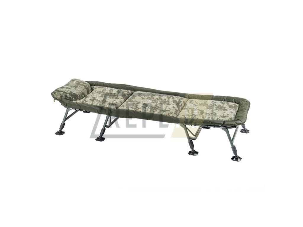 Extrémně lehké, velké a 100% ploché lehátko ve velice atraktivním designu s digitálním maskováním. Nadstandardně silná a velmi komfortní matrace s fleecovou vrchní vrstvou nabízí nejúčinnější systém regulace tuhosti pomocí elastického šněrování na spodní straně. Další výhodou jsou nohy s rozměrnými výkyvnými patkami a možností velkého vysunutí. Lehátko je dostupné ve variantě s osmi nebo se šesti nohami.