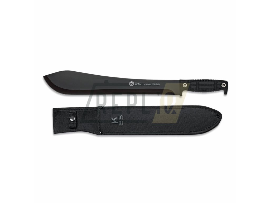 Klasická mačeta v černém provedení od španělského výrobce nožů K25. 36 cm dlouhá čepel z nerezové oceli 440 s titanovým povrchem pro větší odolnost. Gumová rukojeť pro pevné a jisté držení. Na konci rukojeti dírka pro protažení šňůrky a zajištění proti nechtěnému vylétnutí mačety z ruky. Součástí je nylonové pouzdro.