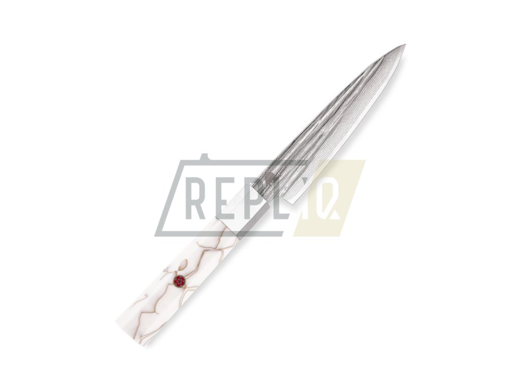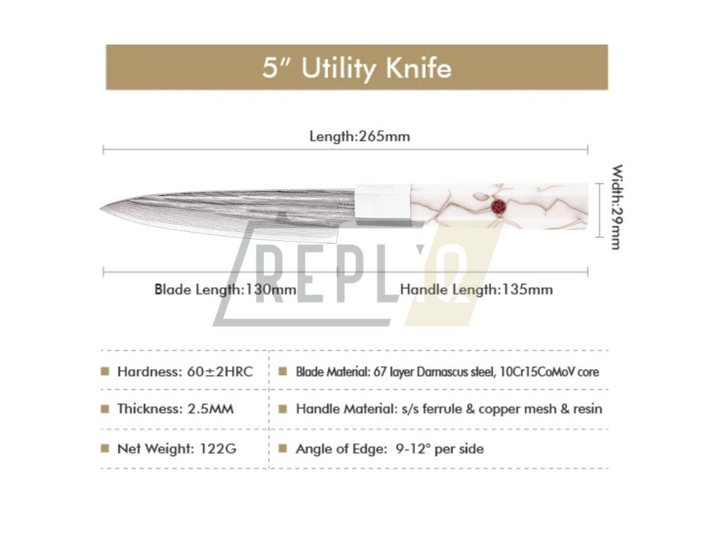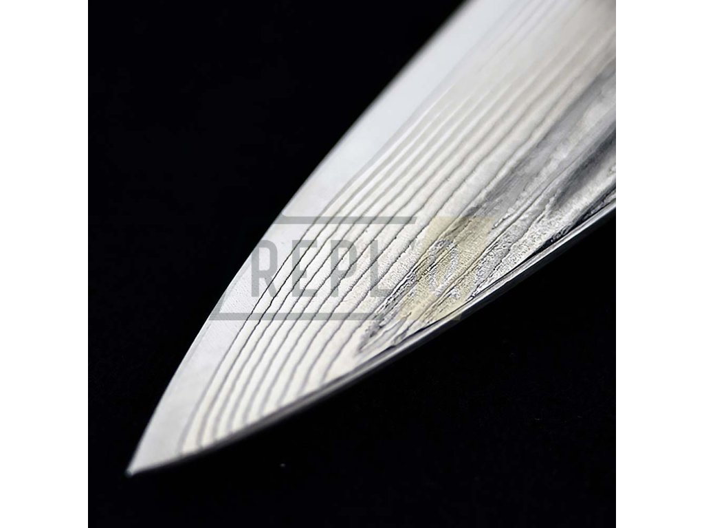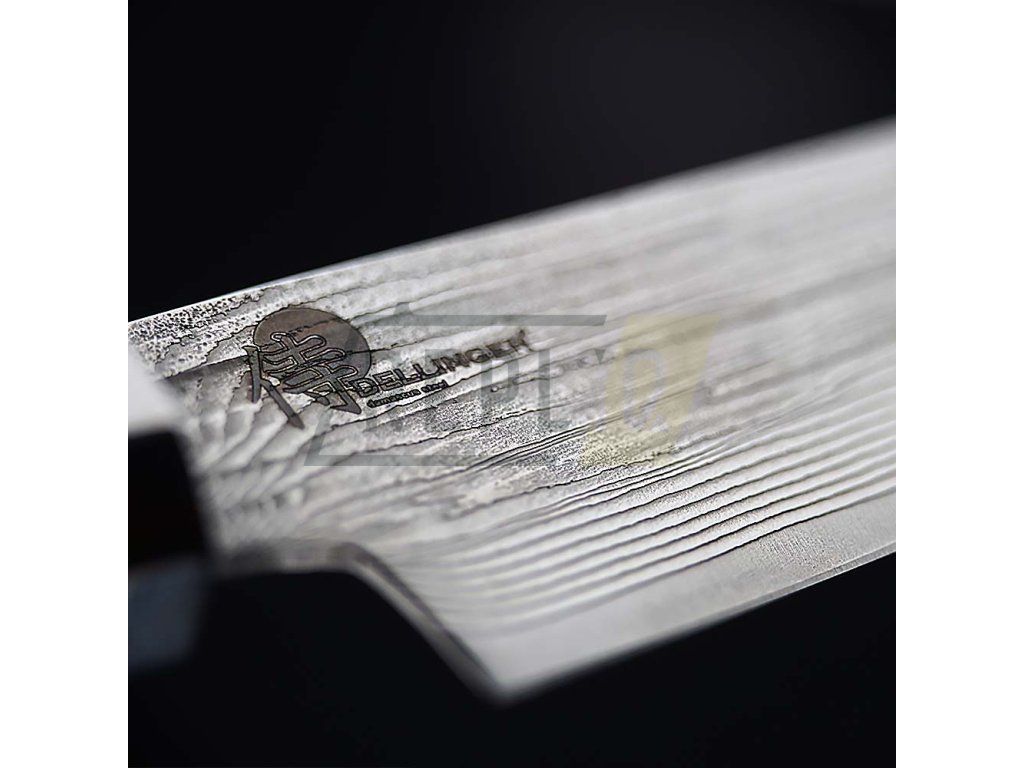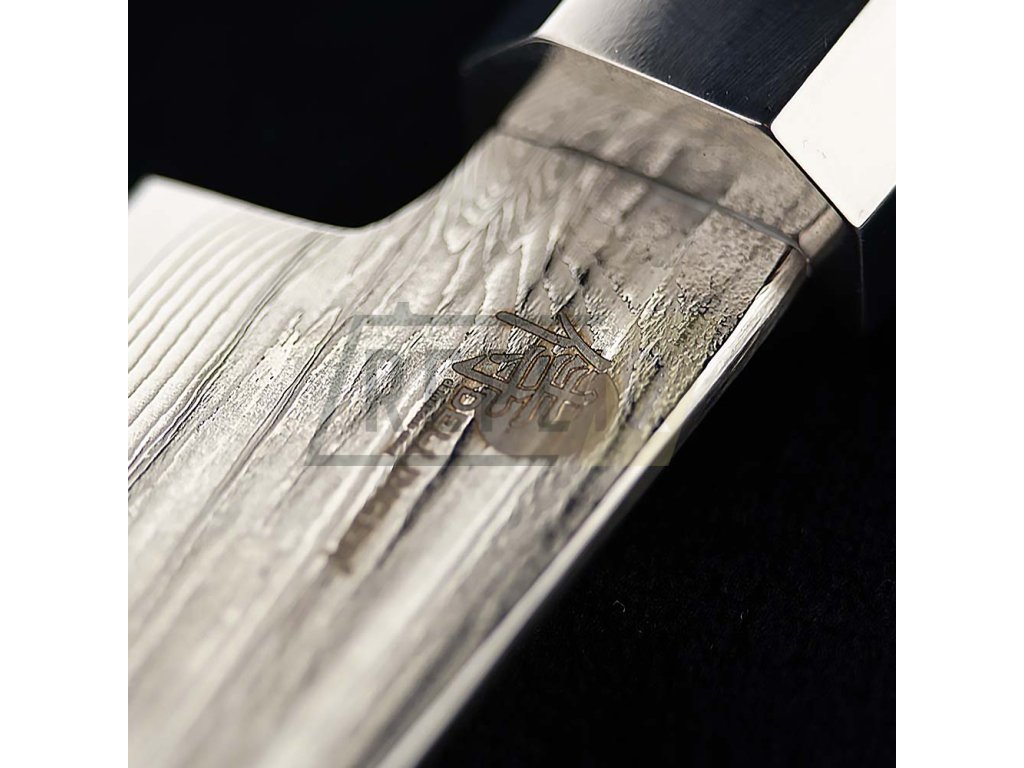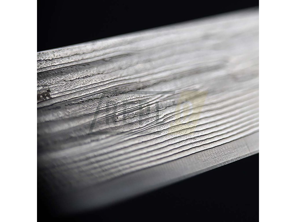 Jádro čepele je vyrobeno z damascénské oceli s tvrdostí 61±1 HRC, obklopené 66 vrstvami dvou druhů nerezové oceli. Toto vrstvení zajišťuje maximální houževnatost a odolnost. Surový vzor ručně kovaného damašku. Neuhlazený, živý povrch s výraznou kresbou vrstev oceli odhaluje skutečný charakter řemeslné výroby a dává každému noži jedinečnou identitu. Precizní zpracování zaručuje snadnou údržbu a dlouhotrvající ostrost, kterou lze snadno obnovit broušením na vodních kamenech.