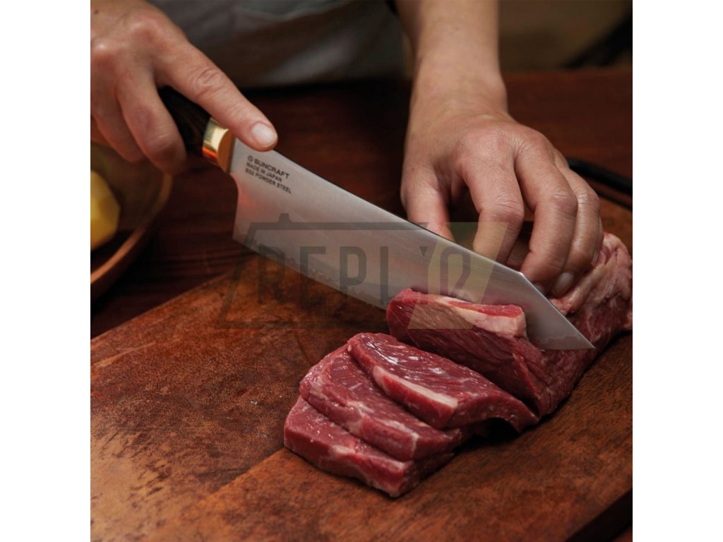 Nože z kolekce Suncraft Elegancia představují dokonalou kombinaci tradičního japonského řemesla a moderních materiálů. Čepele jsou vyrobeny z prémiové nerezové oceli SG2, která je známá svou extrémní ostrostí, dlouhou výdrží a vysokou odolností proti korozi. Vysoká čepel nože a jemně zakřivená rukojeť zvětšují prostor pod rukojetí. I muž s velkou rukou tak může pohodlně uchopit rukojeť, aniž by se při krájení dotýkal prsty desky. Rukojeť skvěle padne do ruky a poskytuje pevný, pohodlný úchop pro maximální kontrolu při krájení. Je symetricky tvarovaná, což znamená, že nůž je vhodný jak pro praváky, tak i pro leváky. Mosazný bolster časem získá patinu a působí elegantněji, ošuntěle a starožitněji. Nůž se tak během let stane vaším vlastním a oblíbeným stejně jako starý přítel. Nože jsou vyrobeny zkušenými řemeslníky ve městě Seki v Japonsku, které je nyní celosvětově proslulé výrobou nožů.