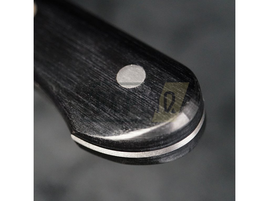 Západní rukojeť je vyrobena z Pakka-wood. Vždy je pečlivě ručně leštěná, ergonomicky tvarovaná a navržena pro vynikající ruční ovládání. Tento nůž je vhodný pro použití pravou i levou rukou. Mozaikový pin umístěný ve středu rukojeti působí japonským dojmem a je dokonalým designovým prvkem.