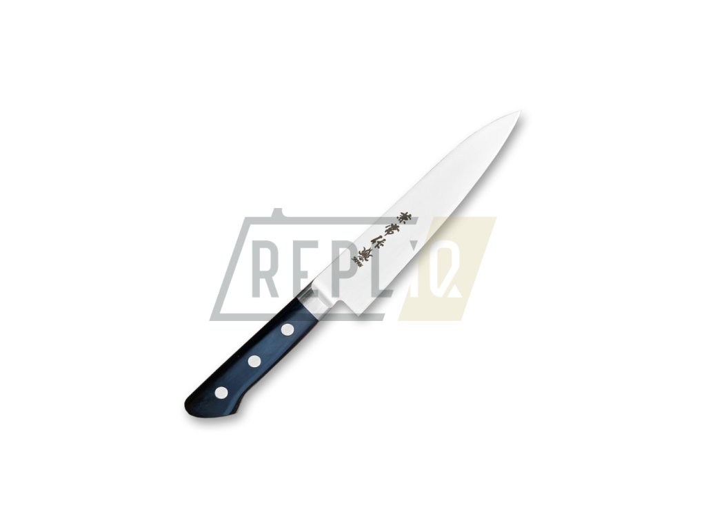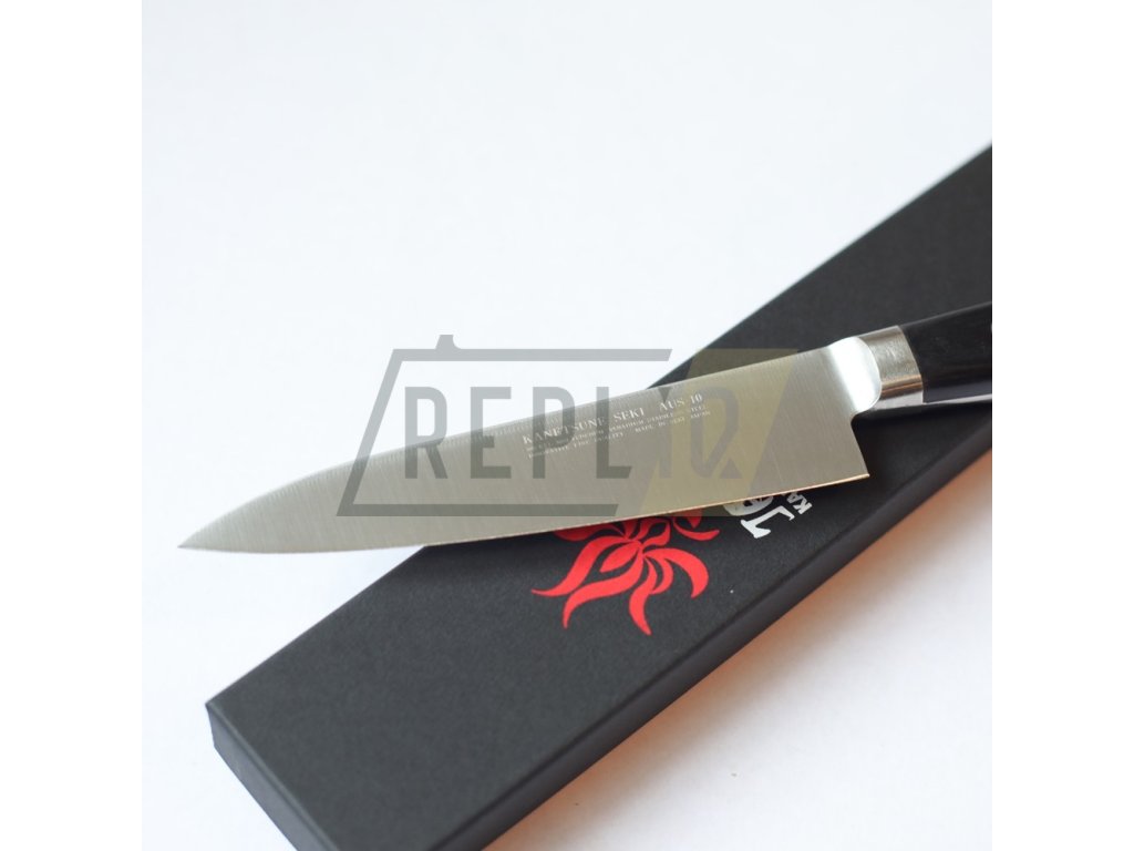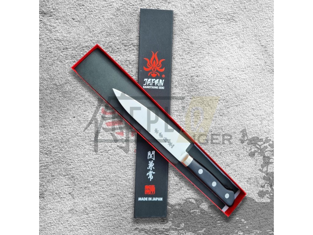 Překrásný všeobecně použitelný nůž Petty ze série Kanetsune AUS 10 PRO series. Nůž Petty je užitečnou alternativou velkého šéfkuchařského nože v okamžiku kdy potřebujete přesné řezy, nebo například krájení zelených fazolí nebo jiné menší zeleniny a ovoce. Jsou vhodné též pro špikování a krájení masa. Zaoblené ostří umožňuje mírné kývání při řezu. Jeho ostrost je ideální pro přípravu sendvičů všeho druhu. Čepel je vyrobena z kvalitní japonské nerezové oceli AUS-10, která obsahuje 0,95 - 1,10% uhlíku a dobře vyvážené složení molybudenu, vanadu a dalších legur. Tato nerezová ocel má vynikající odolnost proti korozi a houževnatost, tvrdost je HRC 59-60. Základní a jednoduchá rukojeť z materiálu Plywood má vynikající přilnavost a vysokou odolnost proti opotřebení. Fulltangová konstrukce (čepel nože prochází celým nožem a rukojeť je pronýtována 3 nýty) zaručuje celkovou konstrukční pevnost.