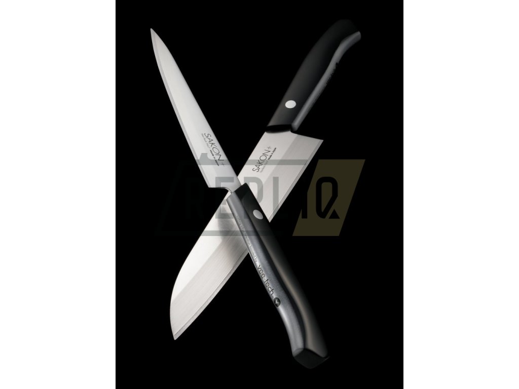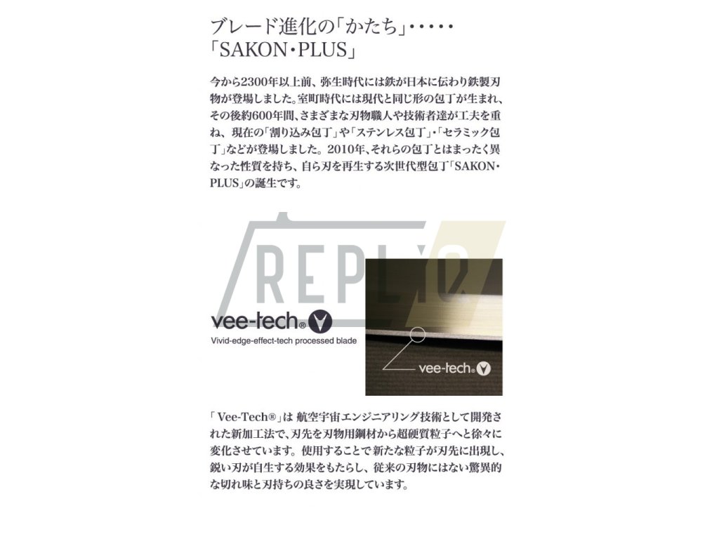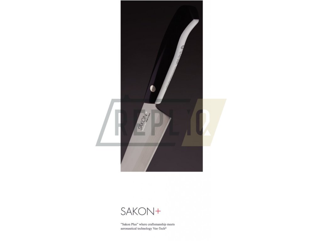Další výhodou Sakon+ Vee-Tech ostří je, že jej můžete brousit podle potřeby kdykoliv za použití konvenčních brousků, protože má čepel na bázi nerezové oceli. Tyto nože můžete tedy používat jak v domácí, tak i v profesionální kuchyni. Sakon+ má jedinečnou rukojeť ze syntetického mramoru, který je zobrazením elegance a chladné krásy. Materiál je neporézní a při správném čištění (vodou a čistícím prostředkem) odolává plísním a bakteriím. To je veškerá péče, kterou Váš nůž Sakon+ potřebuje.