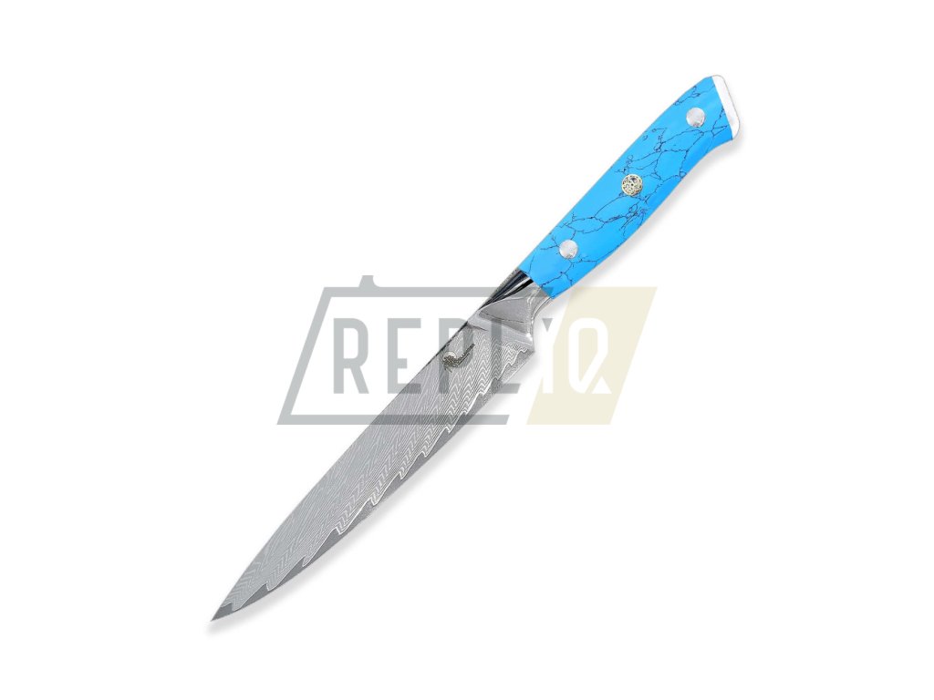 Rukojeť z howlitu je jedinečná nejen svým vzhledem, ale také vlastnostmi. Howlit, přírodní minerál s charakteristickým žilkováním, je často stabilizován a barven, což mu umožňuje dosáhnout široké škály atraktivních barev, od tradiční tyrkysové až po moderní odstíny, jako je růžová či modrá. Díky tomuto procesu se rukojeť stává odolnou vůči vlhkosti, opotřebení a praskání, což zajišťuje její dlouhou životnost. Každý kus je originál, protože žilkování vytváří unikátní vzory, které dodávají noži luxusní vzhled. Rukojeť z howlitu je nejen esteticky poutavá, ale také příjemná na dotek, což zaručuje pohodlný úchop při práci. Tento materiál je ideální volbou pro ty, kteří hledají spojení funkčnosti a elegance.