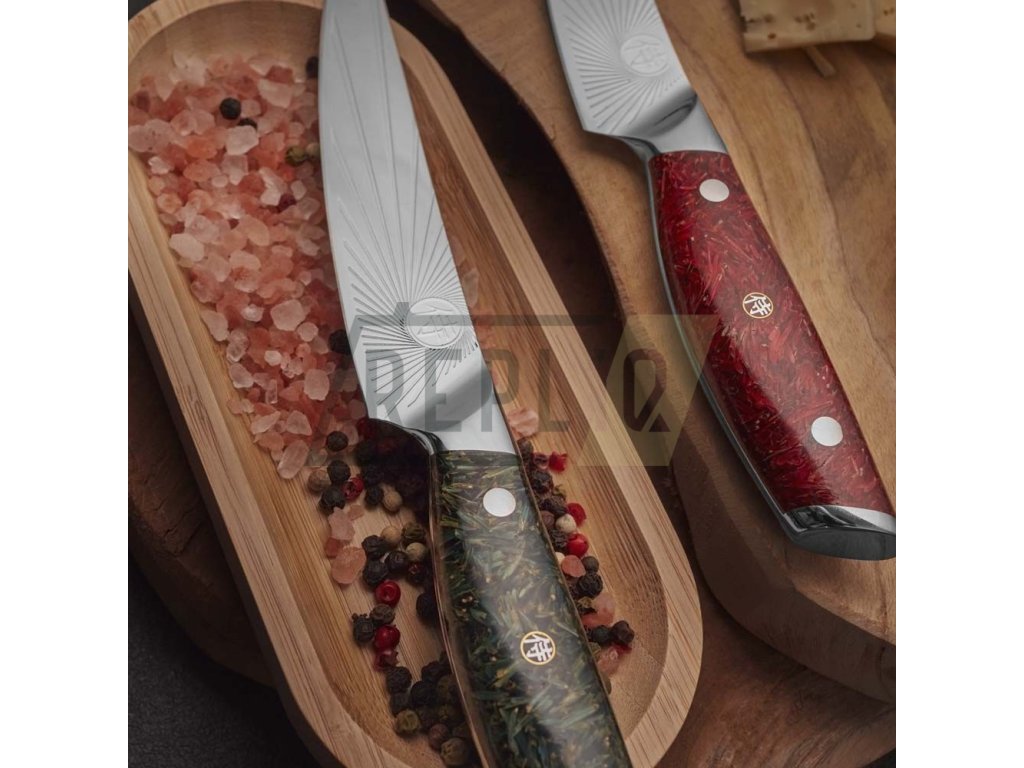 Nože z řady Dellinger Sandvik Northern Sun jsou jako stvořené pro svět moderní a pokrokové kuchyně. K jejich výrobě je zapotřebí nejmodernějších technologií. Čepele jsou laminovány a kovány za tepla s příznačným rotujícím vzorem slunečních paprsků. Tento vzor minimalizuje tření při řezu a zabraňuje přilepení krájeného materiálu. Nože z této jedinečné série jsou pečlivě broušeny pod úhlem 12-15°, což zajistí minimální únik tekutin při krájení ovoce, zeleniny a masa. Vaše pokrmy tak budou plné šťávy a vitamínů – přesně jak vyžaduje nynější kulinářský svět.