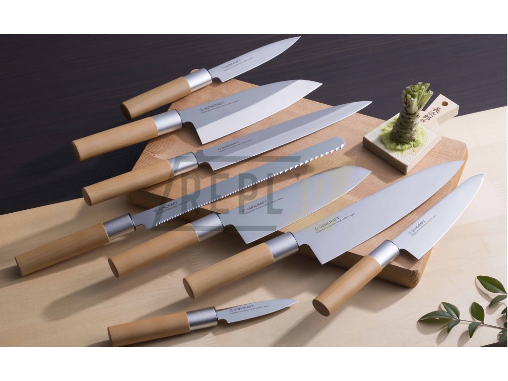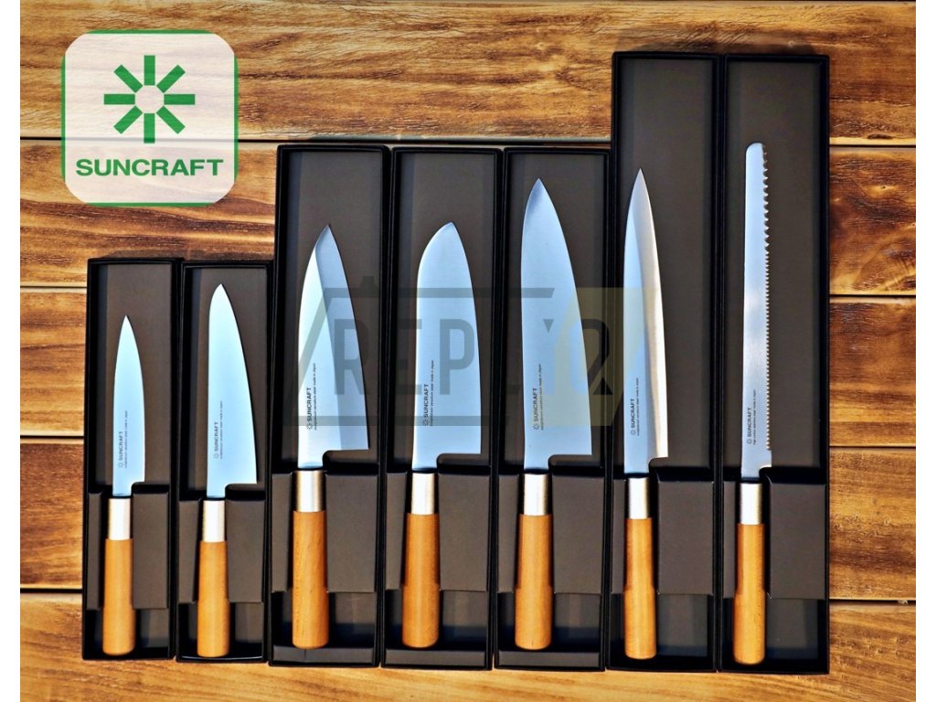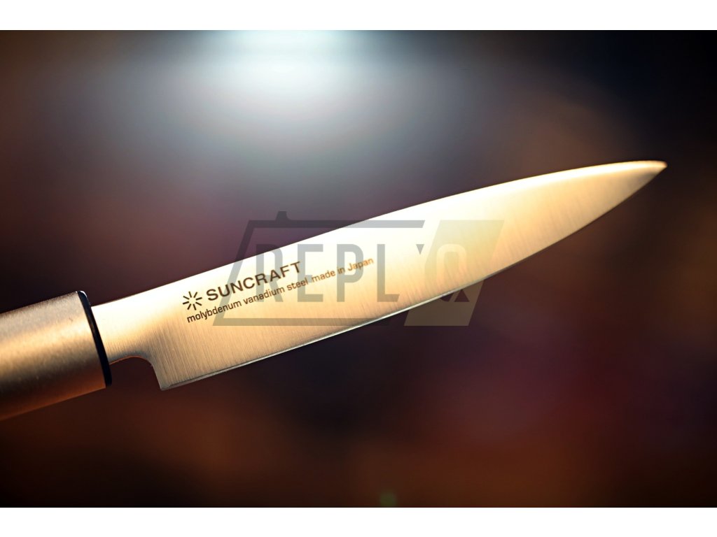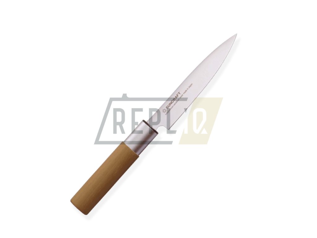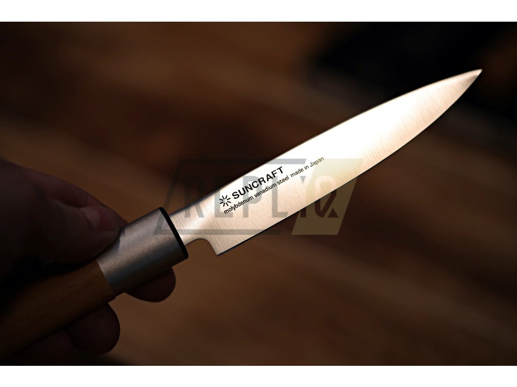 Velmi ostrý japonský nůž Utilityz oceli molybdenum vanadium steel HRC 58 ze série Suncraft SENZO Japanese. Tento nůž je užitečnou alternativou velkého šéfkuchařského nože v okamžiku kdy potřebujete přesné řezy nebo například krájení zelených fazolí nebo jiné menší zeleniny a ovoce. Jsou vhodné též pro špikování a krájení masa. Zaoblené ostří umožňuje mírné kývání při řezu. Jeho ostrost je ideální pro přípravu sendvičů všeho druhu. Tato série nožů je nápadně podobná nožům KAI Wasabi - kvalita a zpracování je však na mnohem vyšší úrovni.