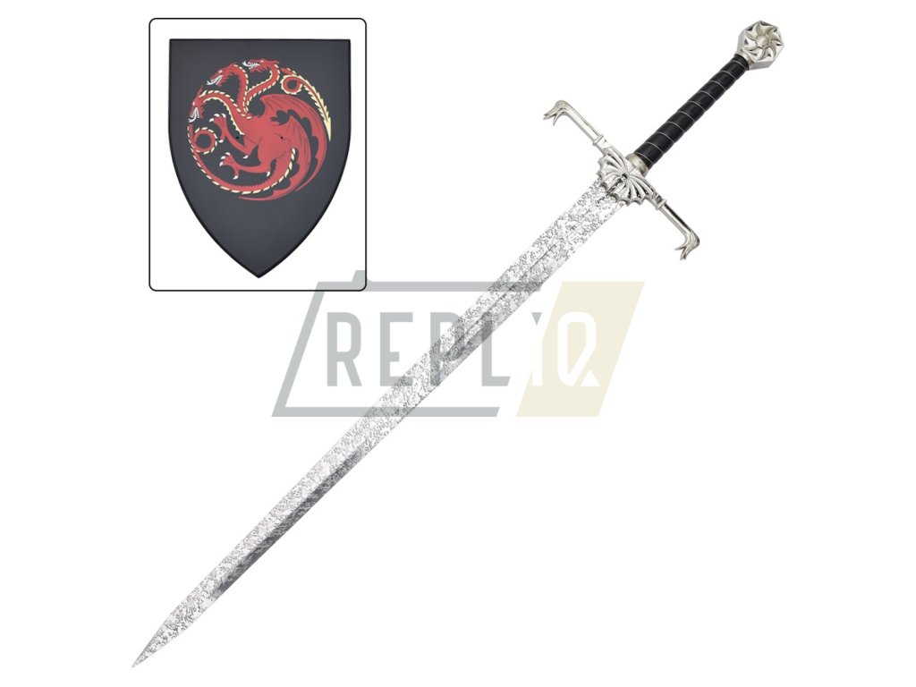 Seriál House of Dragon se odehrává ve fantasy světě 200 let před událostmi Game of the Thrones. Podle legend je meč Blackfyre vyroben ze vzácné valyrijské oceli schopné zabít bílé chodce. Původně patřil Aegonovi I. Targaryenovi , jenž ho nosil při dobývání Sedmi království. Později se stal ceněnou čepelí rodu Targaryenů, kterou nosili králové a princové. Meč následně dědili potomci Viserys I a další.Nebroušená čepel meče Blackfyre má délku 860 mm. Povrch čepele napodobuje zmrzlou ocel. Celková délka meče činí 1 150 mm a hmotnost pak 1 100 g.