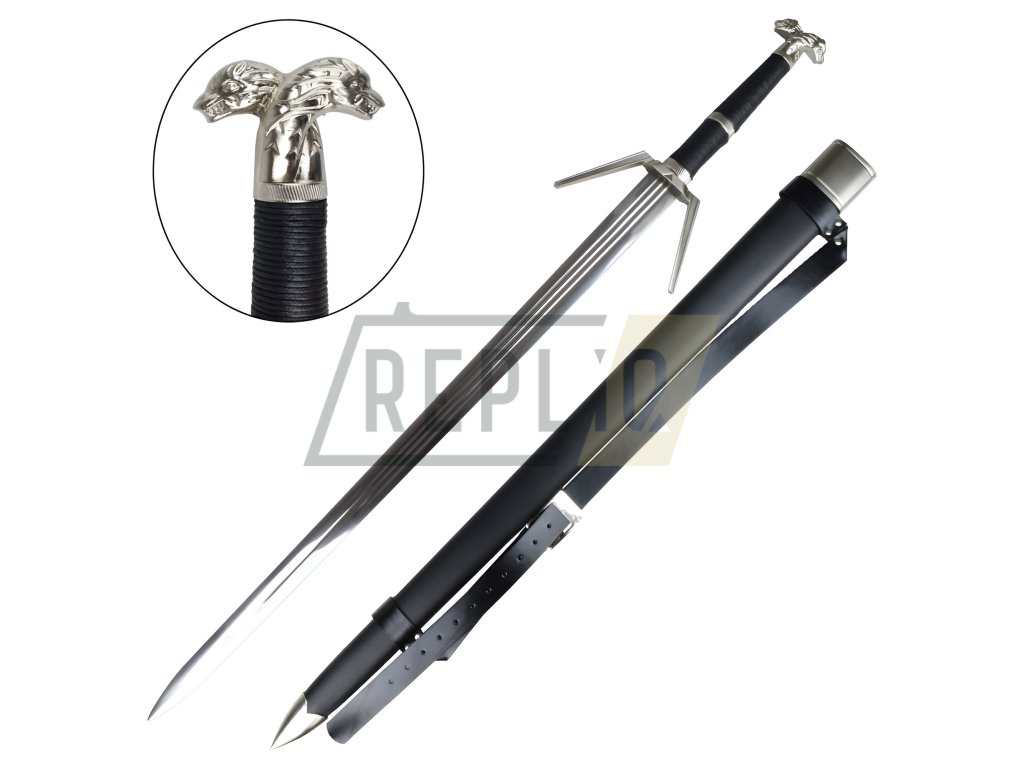Tato replika meče byla inspirována fantasy RPG hrou Zaklínač - divoký hon.Dlouhý dvouruční stříbrný meč zaklínače Gralta z Rivie s vidlicovou záštitou, černou omotávkou rukojeti a hruškou se dvěmi hlavami vlka.