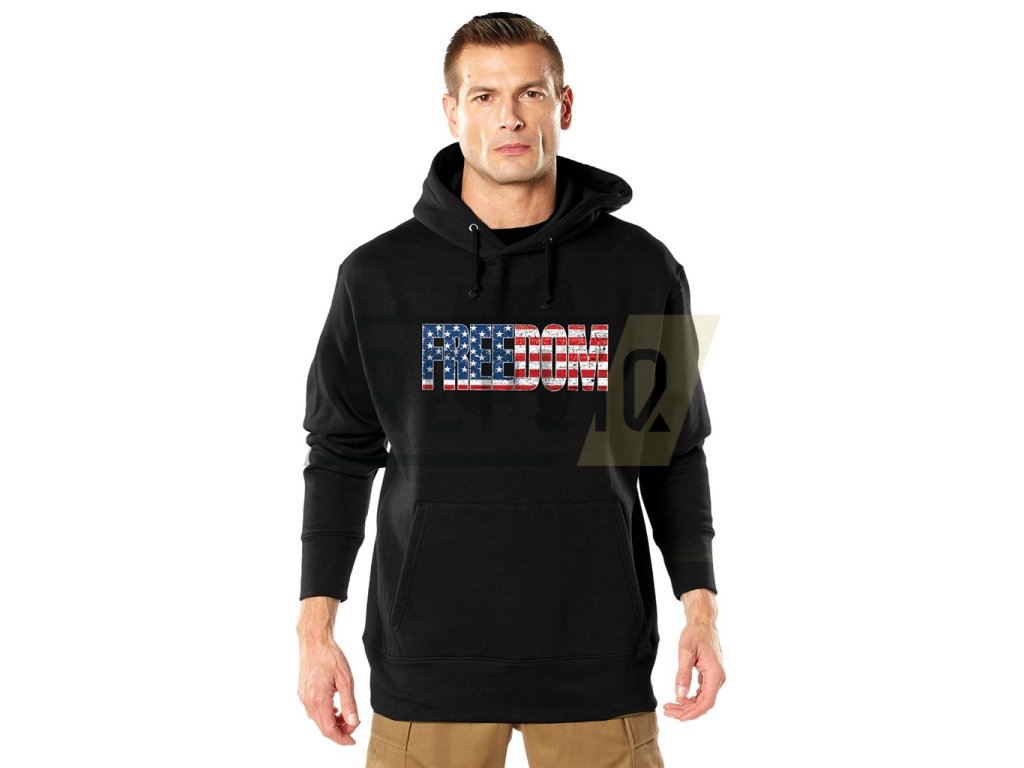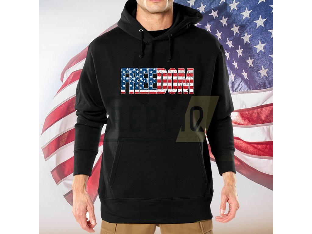 Hřejivá mikina s kapucí a nápisem FREEDOM (svoboda) vyvedeným ve stylu americké vlajky. Mikina je vyrobená z na omak velmi příjemného směsného materiálu v poměru 50% bavlna, 50% polyester. Přední kapsa klokanka je vhodná pro uložení drobnější výbavy, popřípadě díky širokým vstupům pojme ruce v rukavicích. Manžety rukávů jsou zakončené elastickým úpletem. Elastický úplet je použitý i na spodním lemu mikiny. Dvouvrstvou kapuci je možné stáhnout pomocí šňůrek.