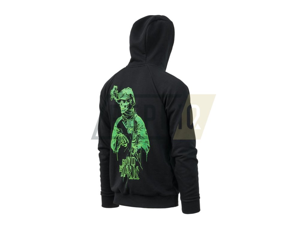 Velmi pohodlná mikina s předním logem značky DIRECT ACTION a se zadním vyobrazením kostlivce s taktickým vybavením a nápisem INTO THE DARK (do temnoty). Mikina disponuje kapsou klokankou, velikostně nastavitelnou kapucí a elastickým spodním lemem a manžetami rukávů.