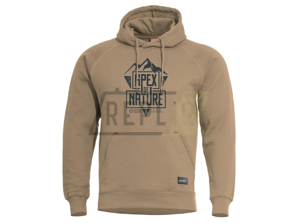 Pohodlná mikina s kapucí vyrobená z měkkého a hřejivého směsného materiálu, který zabraňuje vzniku nepříjemných pachů při dlouhém nošení. Kapuce je hluboká s velikostním nastavením pomocí tkalounů. Mikina je opatřena jednou kapsou "klokankou", elastickým spodním lemem a elastickými manžetami rukávů. Nápis APEX OF NATURE.