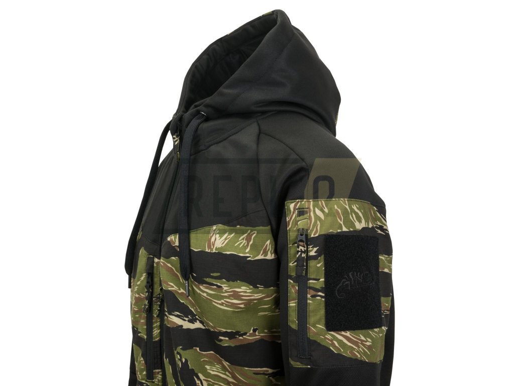 Kapsy na ruce jsou prostorné a najdete v nich celkem čtyři menší přihrádky. Další dvojici kapes naleznete na hrudi. Ty jsou přístupné skrze mohutné zipy opatřené táhly. Poslední dvě kapsy se nachází na ramenou, ty jsou z vnější strany opatřeny panely suchého zipu pro vaše VELCRO nášivky. Rukávy jsou zakončeny elastickými náplety. Kapuce je velikostně nastavitelná pomocí tkalounů.