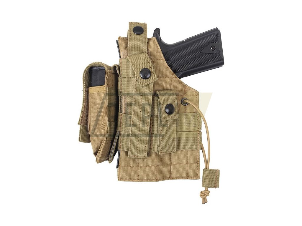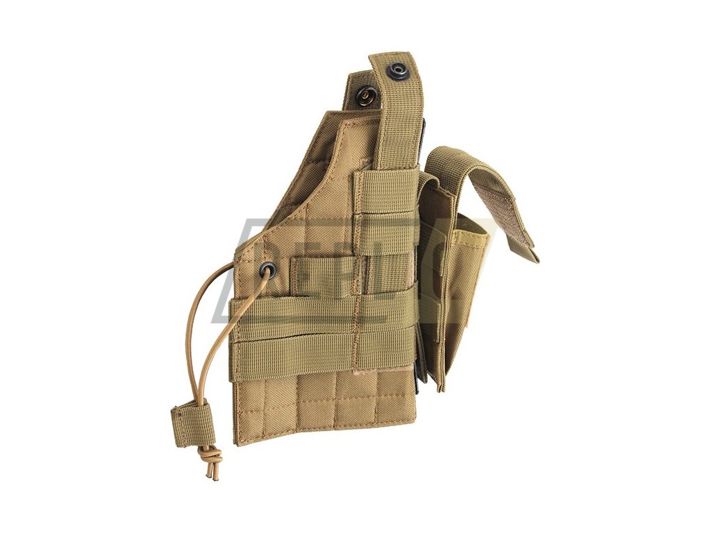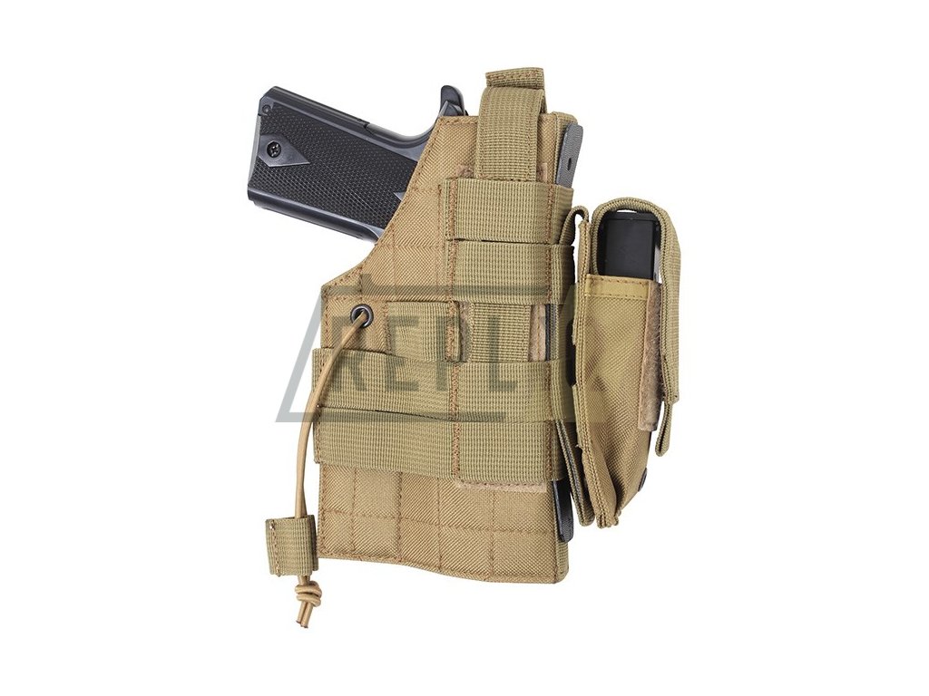 Pistolové pouzdro s elastickým popruhem pro bezpečné uložení zbraně v pouzdře. Samostatná kapsa na zásobník, odnímatelné MOLLE popruhy - lze uzpůsobit pro praváky i leváky. Materiál: 600D polyester.