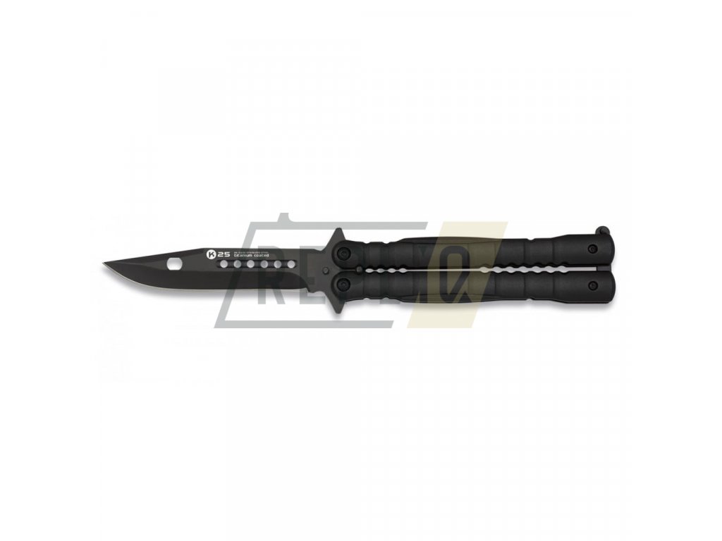 Zavírací nůž typu motýlek značky K25. Čepel s hladkým ostřím je vyrobena z nerezové oceli. na hliníkové rukojeti je na konci fixační západka.