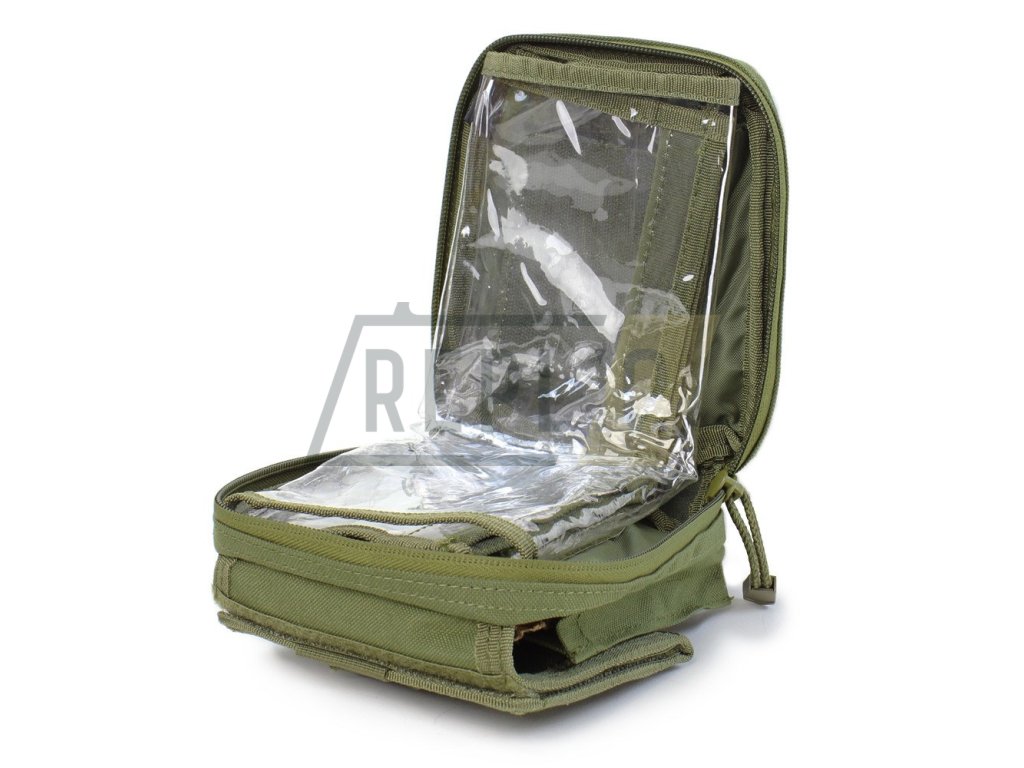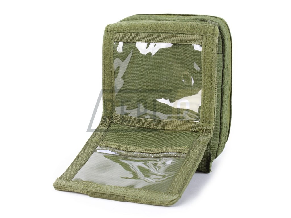 - na přední straně složená klopa, uvnitř které jsou dvě průhledná ID okénka, zvenku panel se suchým zipem