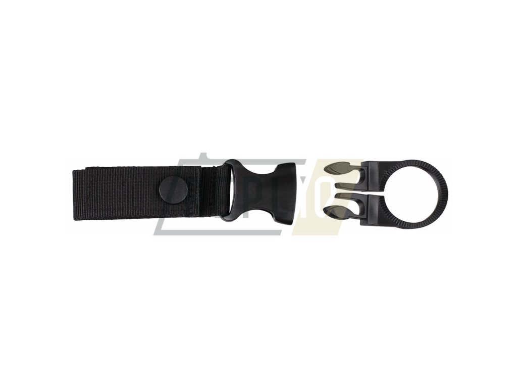 Univerzální opaskový držák na plastové láhve. Láhev se v držáku snadno fixuje a díky upevnění pomocí plastové FASTEX přezky nehrozí její uvolnění. Držák je kompatibilní s MOLLE/PALS modulárním systémem, lze tak jednoduše připojit k batohu, vestě apod.