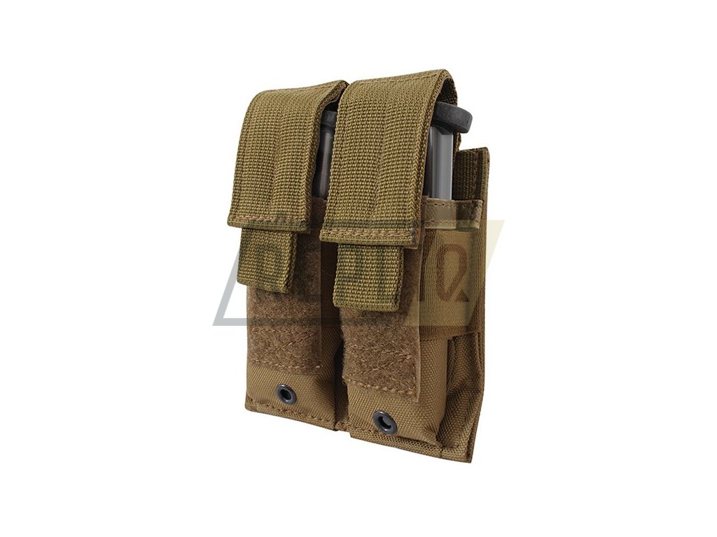 Dvojité pouzdro na pistolové zásobníky, MOLLE kompatibilní. Klopy se zapínáním na suchý zip. Rozměr: 11 x 12,5 cm. Materiál: 600D polyester.