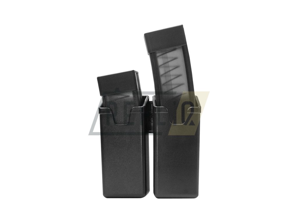 Rotační plastové pouzdro na 2 zásobníky do samopalů CZ Scorpion EVO a do zbraní řady GP Stribog (9×19 Luger), můžete v něm nosit také zásobníky do HK MP7 a pistolí FN Five-seveN® Mk2. Dovoluje velmi rychlé vyjmutí zásobníku. Samosvorná konstrukce s fixační pružinou, vyrobeno z vysoce odolného plastu, určené pro profesionální použití, nahrazuje klasickou textilní sumku. Klip UBC-04-2 souží pro upevnění pouzdra na vazbu MOLLE a umožňuje rotaci zásobníku v rozsahu 360° (16 aretovaných poloh) bez použití nářadí.