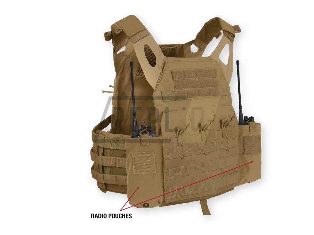 Sada dvou pouzder (pravé + levé) na radiostanici nebo podobně velké vybavení. Otevřená konstrukce s jistícími elasickými šňůrkami. Pouzdra se zajišťují suchým zipem pod přední chlopeň vesty a nosí se pod modulárními boky vesty blíže k tělu.