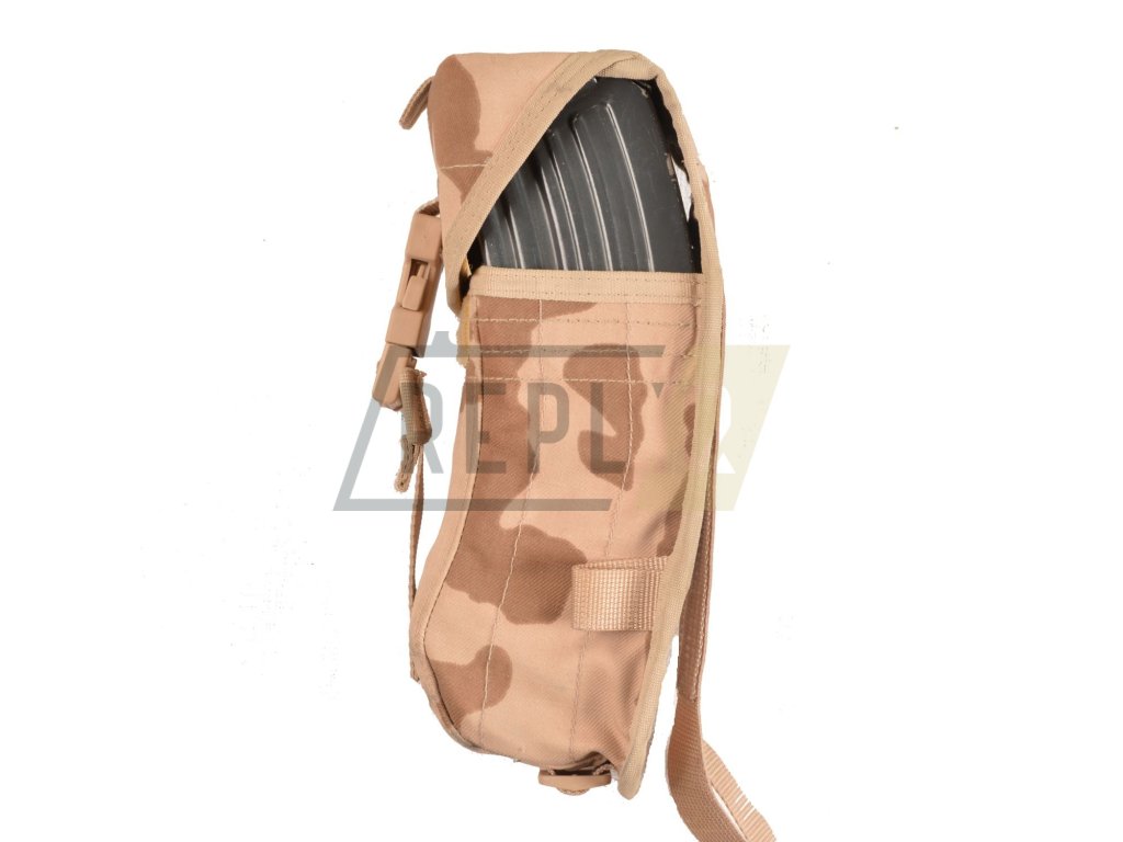 Sumka pro tři zásobníky samopalu SA58. Zásobníky se umísťují vedle sebe na výšku. Zajištění klopou s fastex sponou. Uchycení pomocí MOLLE systému NPP-2006. Použité - výprodej armády ČR, v dobrém stavu nepoškozeno.