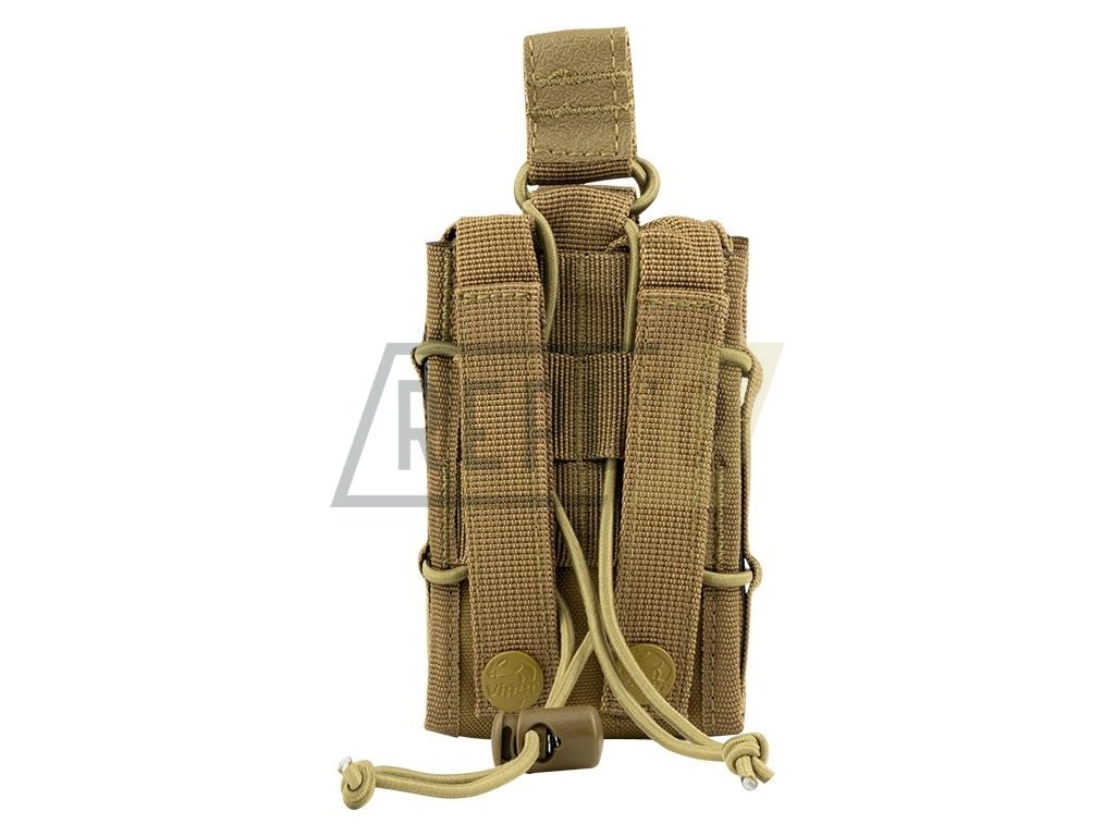 Pouzdro, do kterého díky jeho variabilitě pasují různé druhy zásobníků. MOLLE popruhy, elastické (bungee) popruhy. Materiál 600D Cordura. Rozměry: cca 12 x 8 x 3 cm.