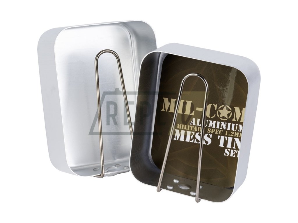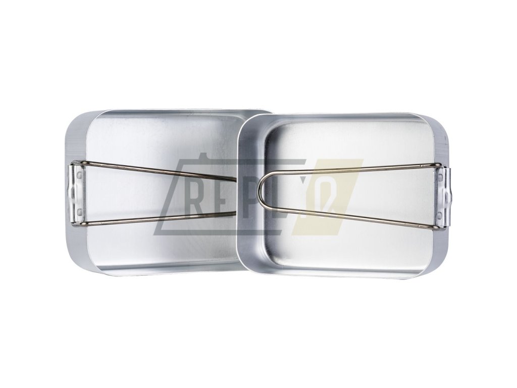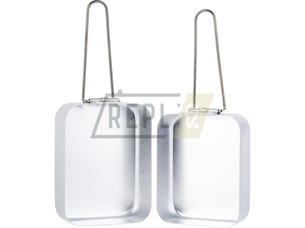 Dvoudílný hliníkový jídelní set se sklopnými uchy. Rozměry: 18.5 x 13.5 x 6 cm a 16.5 x 13 x 5.5 cm.