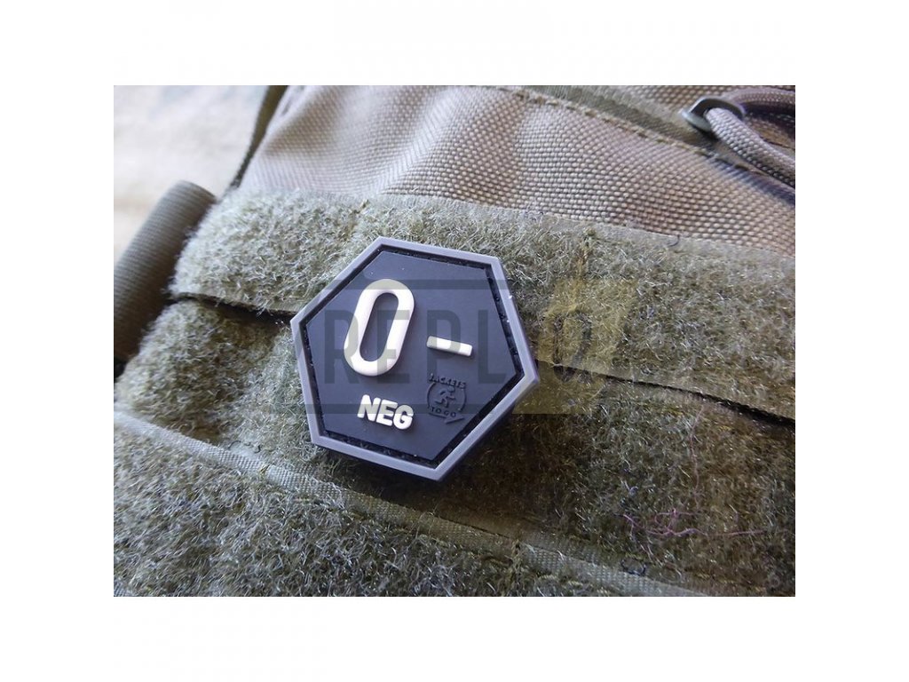 3D plastová nášivka s krevní skupinou, ve tvaru šestiúhelníku. Okraj nášivky obšitý nití. Na zadní straně se suchým zipem pro možnost připevnění na veškeré vybavení nebo výstroj s velcro panelem - na taktickou košili, blůzu, bundu, batoh..