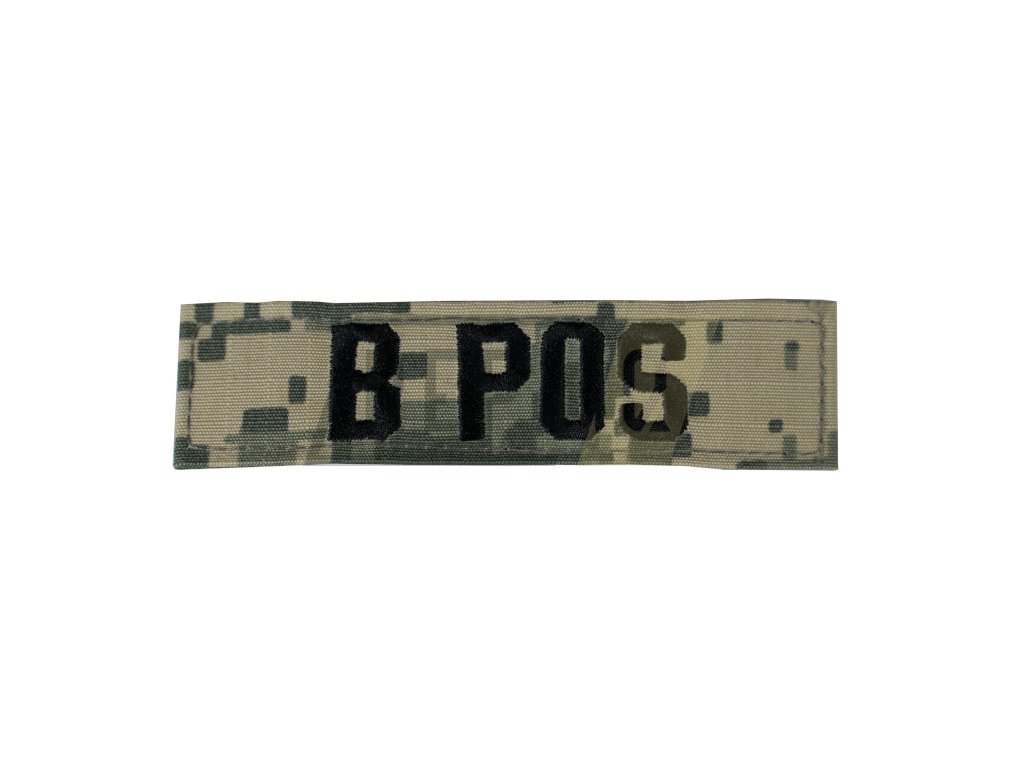 Nášivka s označením krevní skupiny. Na rubu se suchým zipem. Rozměr cca 10 x 2,5 cm. Látka s maskováním UCP - ACU Digital, provedení rip-stop.