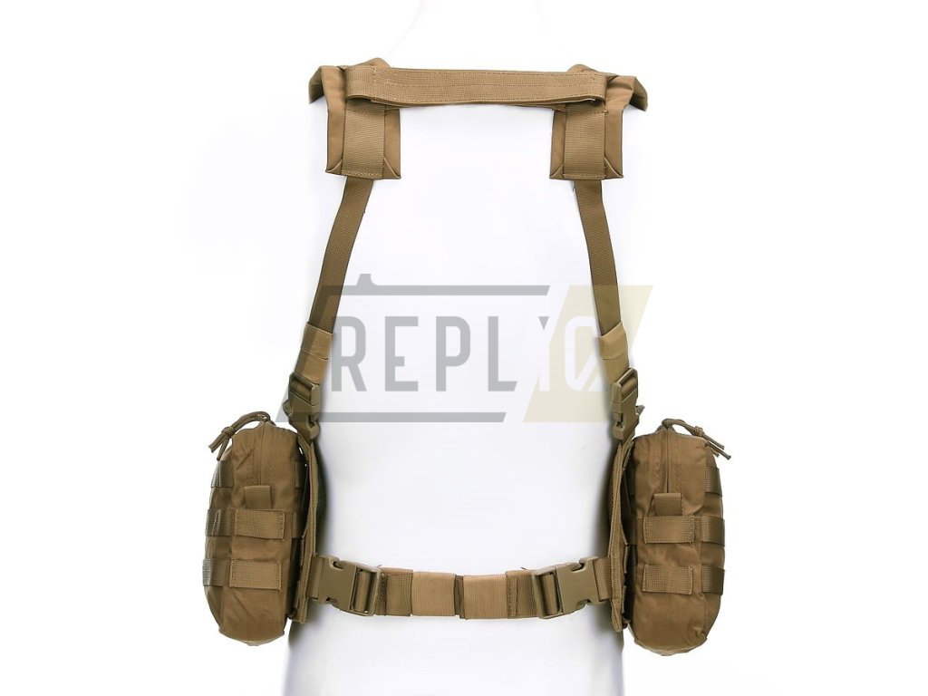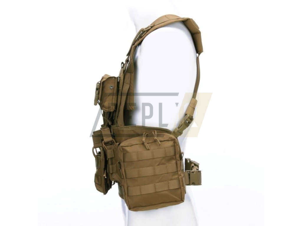 Praktická vesta/chest rig vyrobená z odolného Cordura nylonu. Vesta je pošita velkým množstvím modulární vazby standardu MOLLE/PALS, takže její nosnou kapacitu můžete snadno rozšířit o další kompatibilní sumky a pouzdra. V základu je vesta osazena jedním administračním panelem, pouzdrem na rádio, dvěma sumkami na zdravotnické vybavení a celkem sedmi sumkami na M4 zásobníky. V případě potřeby lze čelní přihrádka osadit neprůstřelným panelem.